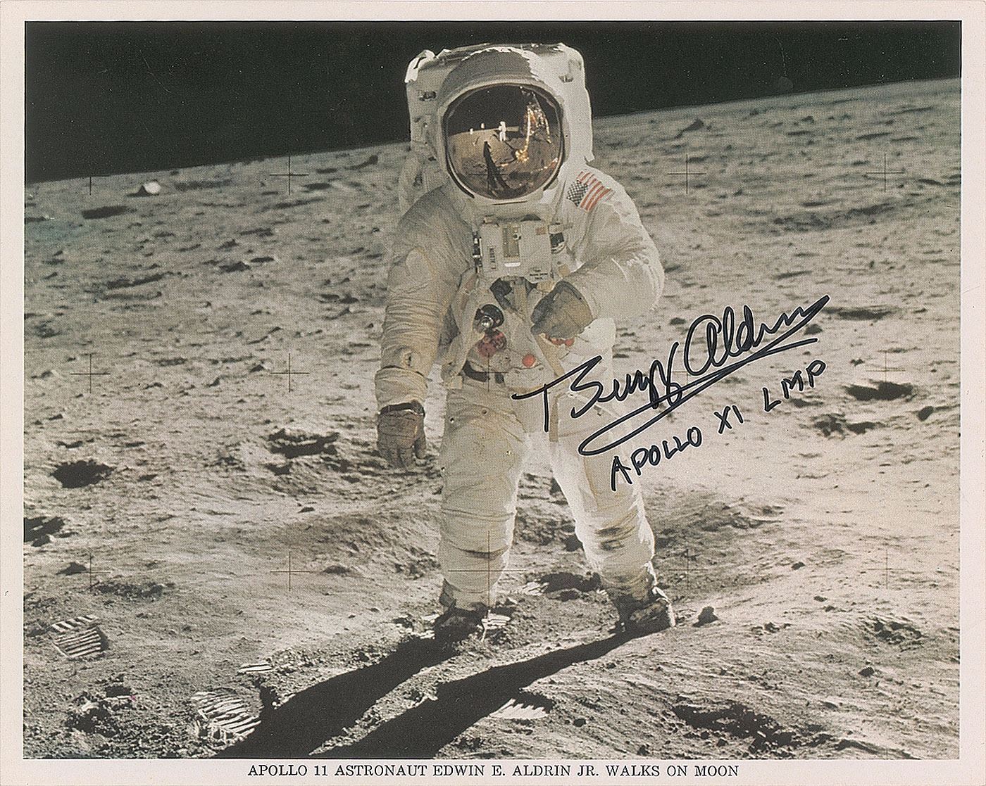 Official color 10 x 8 NASA lithograph of Aldrin standing on the lunar surface, signed in black felt tip, "Buzz Aldrin, Apollo XI LMP." In very fine condition. An ideal example of this iconic moment.