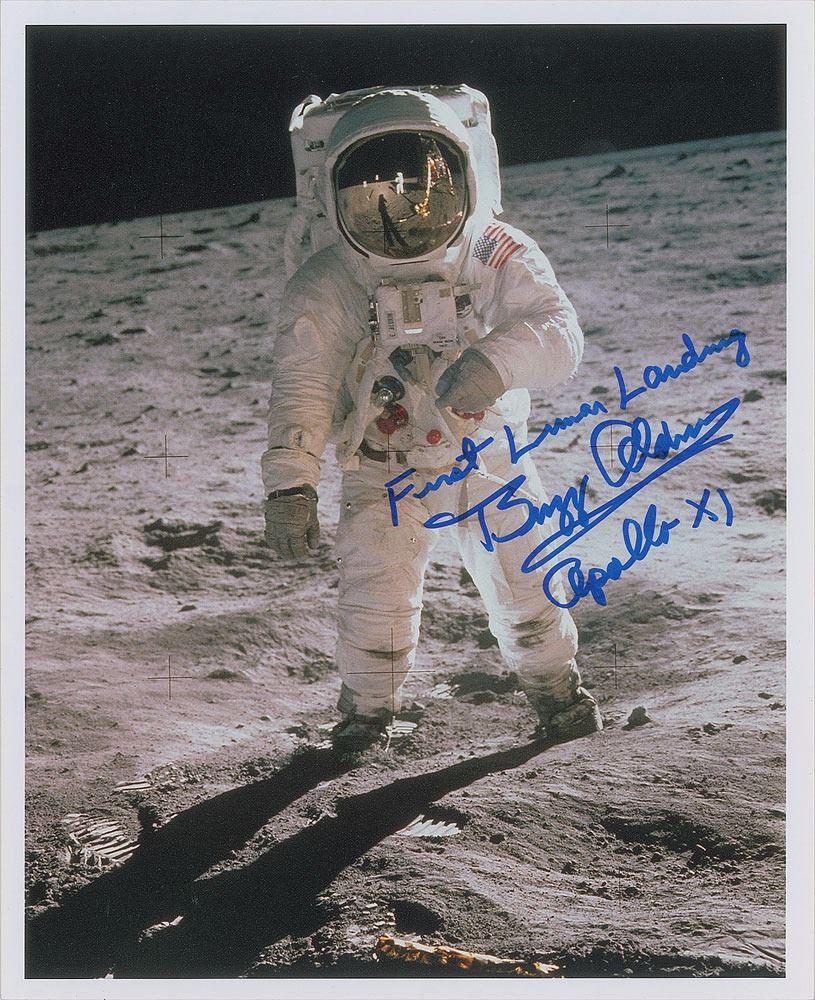 Color satin-finish 8 x 10 full-length photo of Aldrin standing on the lunar surface, his visor showing a small reflection of the photographer, Neil Armstrong, signed in blue felt tip, "First Lunar Landing, Buzz Aldrin, Apollo XI." In very fine condition.