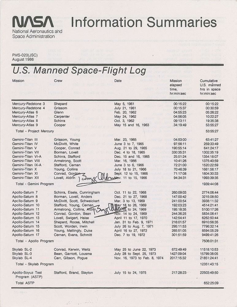 NASA Information Summaries sheet, 8.5 x 11, dated August 1986 and listing various statistics for the "U.S. Manned Space–Flight Log" for missions starting with Mercury–Redstone 3 and ending with STS–51–L, signed twice in black ink by Buzz Aldrin. In fine condition, with some lights bends and creases.