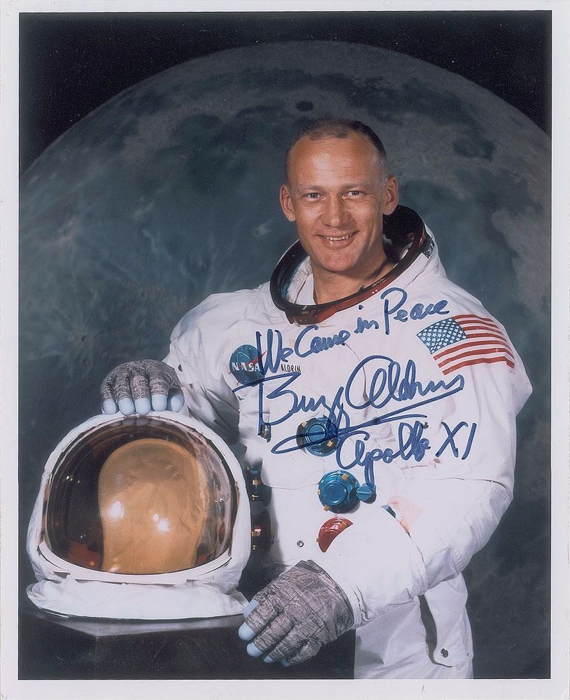 Color satin-finish 8 x 9.75 half-length photo of Aldrin posing in his white space suit against a lunar background, signed in black felt tip, "We came in Peace, Buzz Aldrin, Apollo XI." Affixed to a same-size cardstock mount. In fine condition.