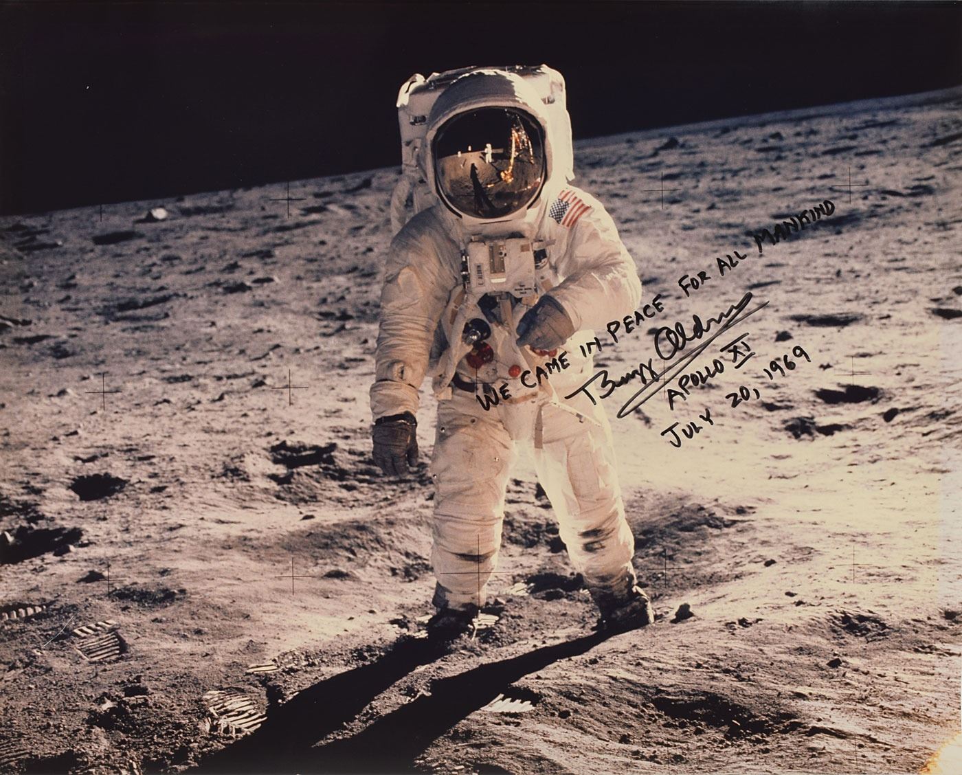 Huge color satin-finish 20 x 16 full-length photo of Aldrin standing on the lunar surface, his visor showing a small reflection of the photographer, Neil Armstrong, signed in black felt tip, "We came in peace for all mankind, Buzz Aldrin, Apollo XI, July 20, 1969." In fine condition.