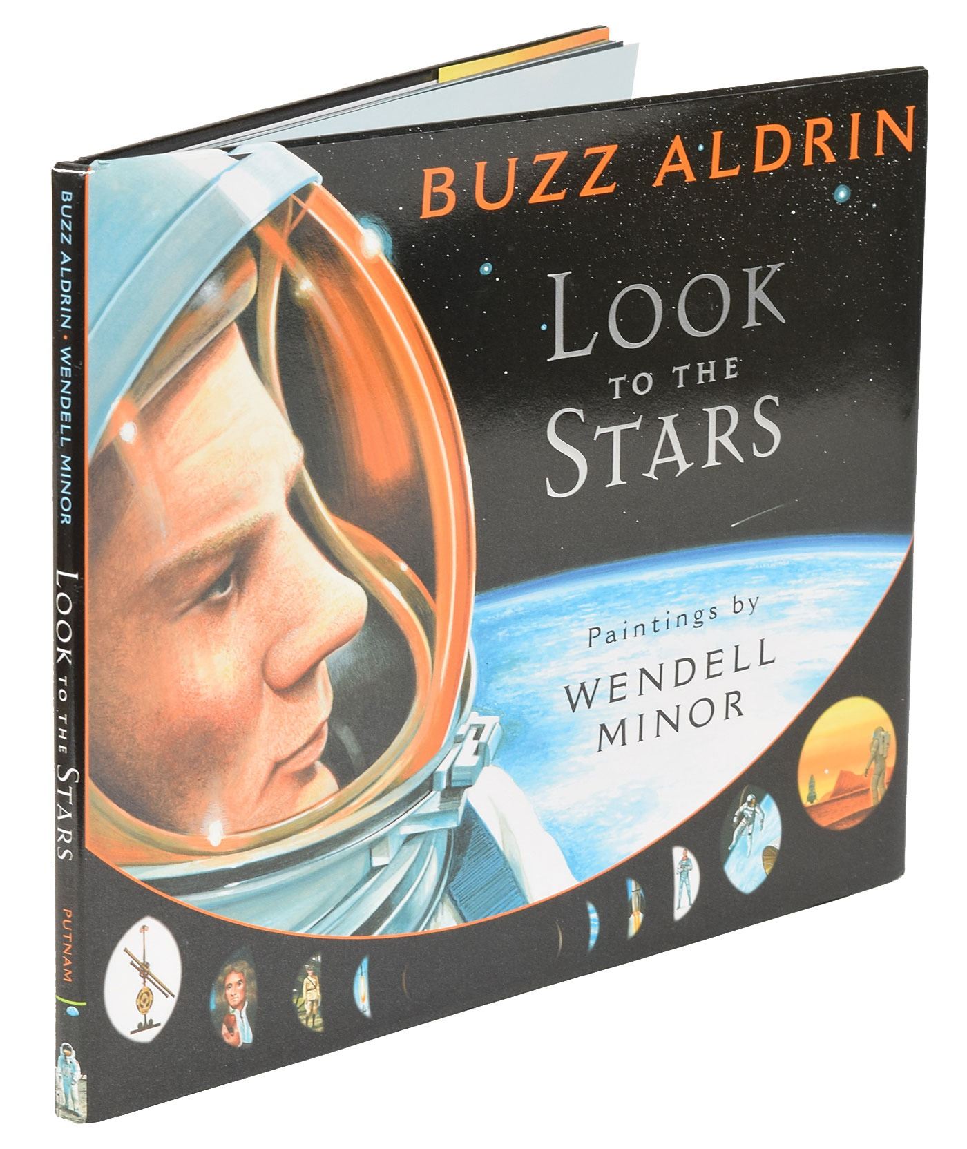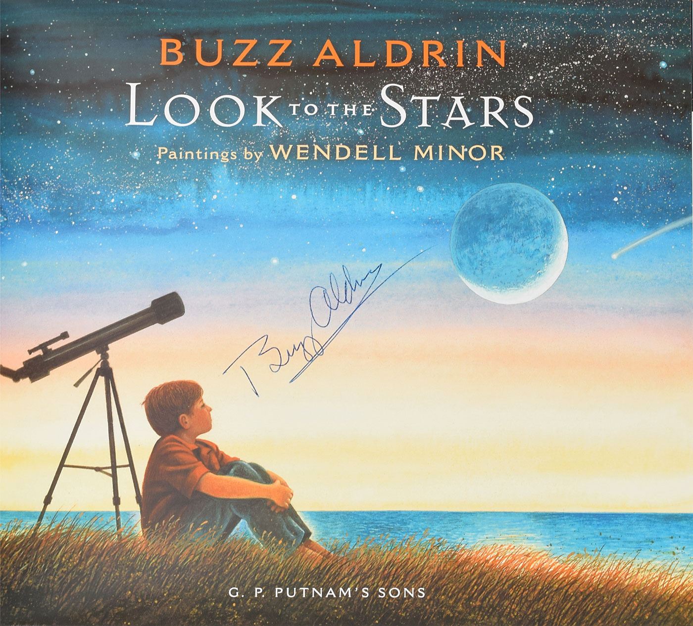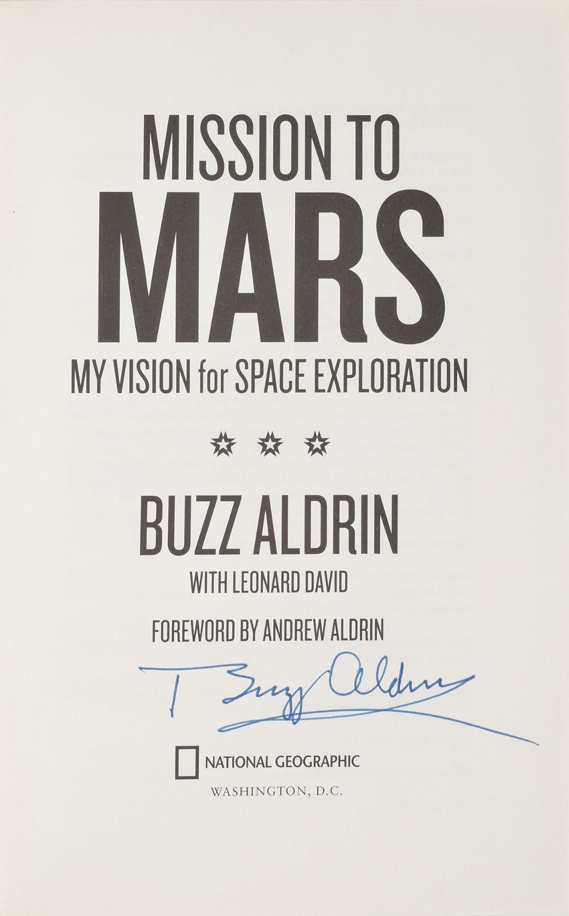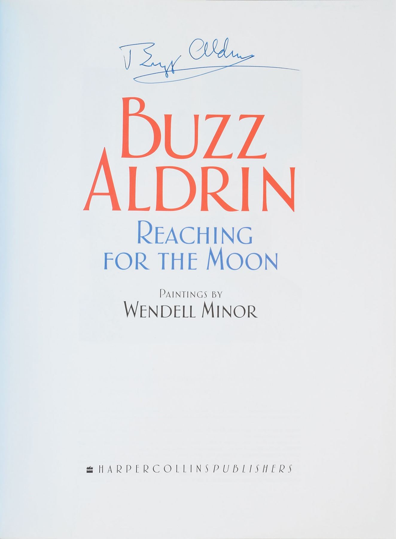 Three books, each hardcover with dust jacket, signed on the title page in blue or black ink by Aldrin, with titles including: Mission to Mars; Reaching for the Moon; and Look to the Stars. In overall fine condition.