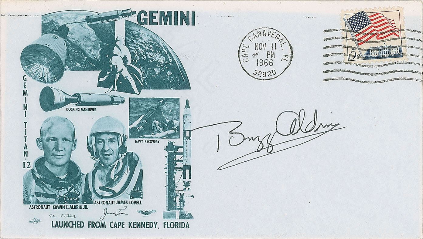Launch day cover with a cachet commemorating the Gemini 12 mission, postmarked at Cape Canaveral on November 11, 1966, signed in black ballpoint by Buzz Aldrin. In fine condition.
