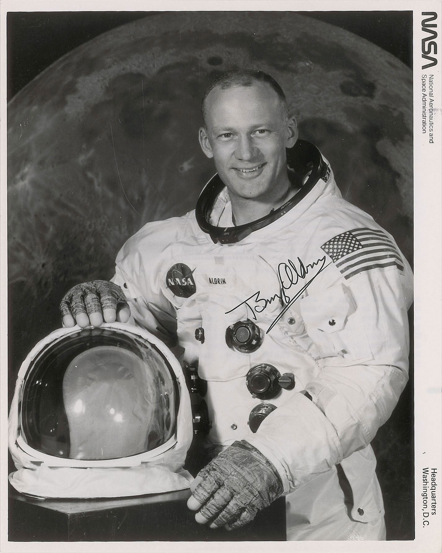 Official glossy 8 x 10 NASA photo of Aldrin posing in his white space suit, boldly signed in black felt tip. Reverse bears purple NASA caption text. In fine condition, with mild surface impressions.