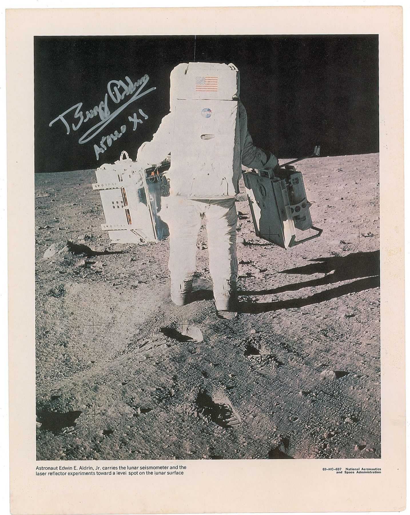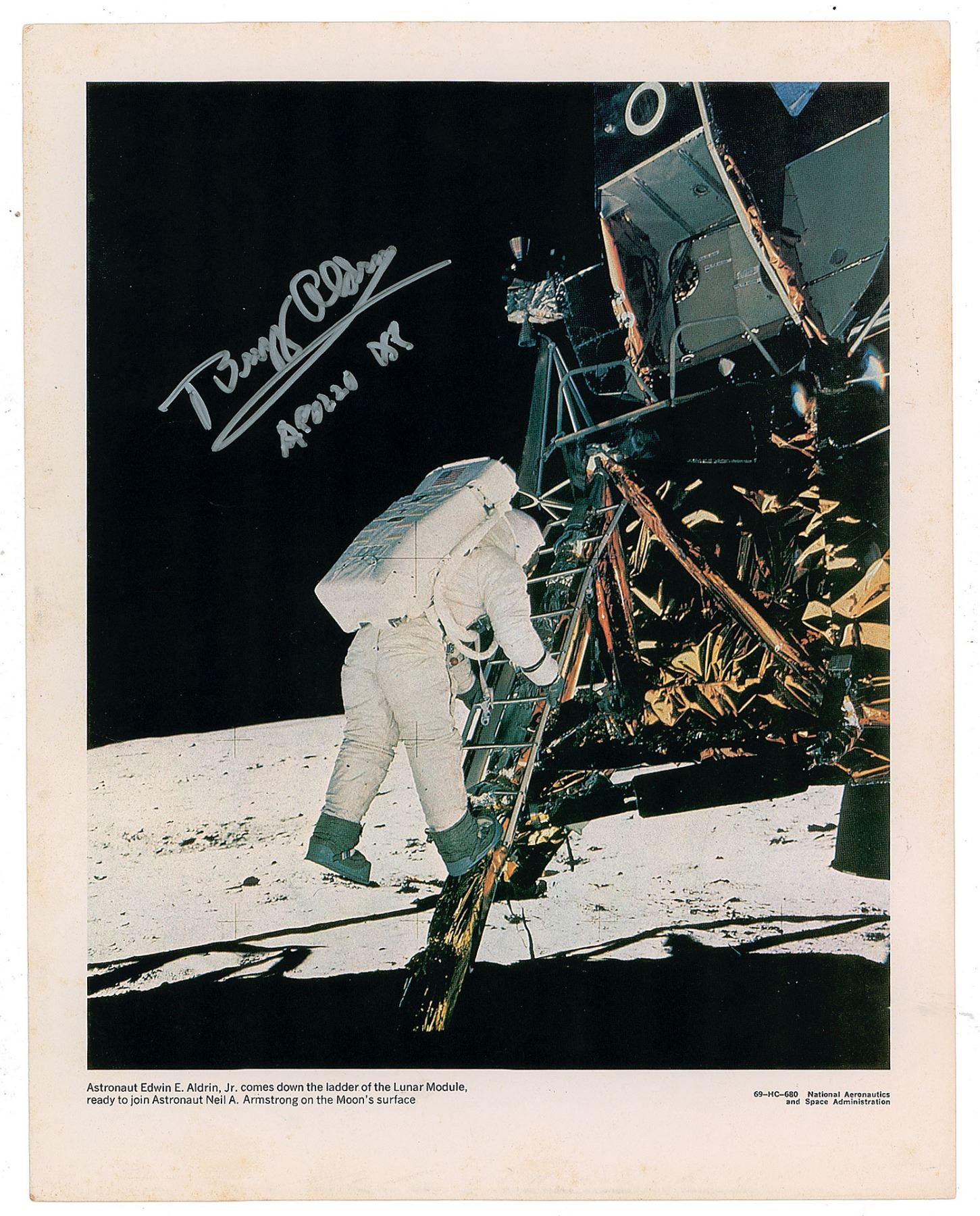 Offered directly by Buzz Aldrin, a fantastic pairing of oversized lithos: an official color 11 x 14 NASA lithograph of him descending the Lunar Module's ladder, signed in silver ink, "Buzz Aldrin, Apollo XI"; and an official color 11 x 14 NASA lithograph of him carrying lunar experiment packages, signed in silver ink, "Buzz Aldrin, Apollo XI." In fine condition, with some light rippling. Proceeds benefit Aldrin’s new Human SpaceFlight Institute, a premier think-tank and innovation center.