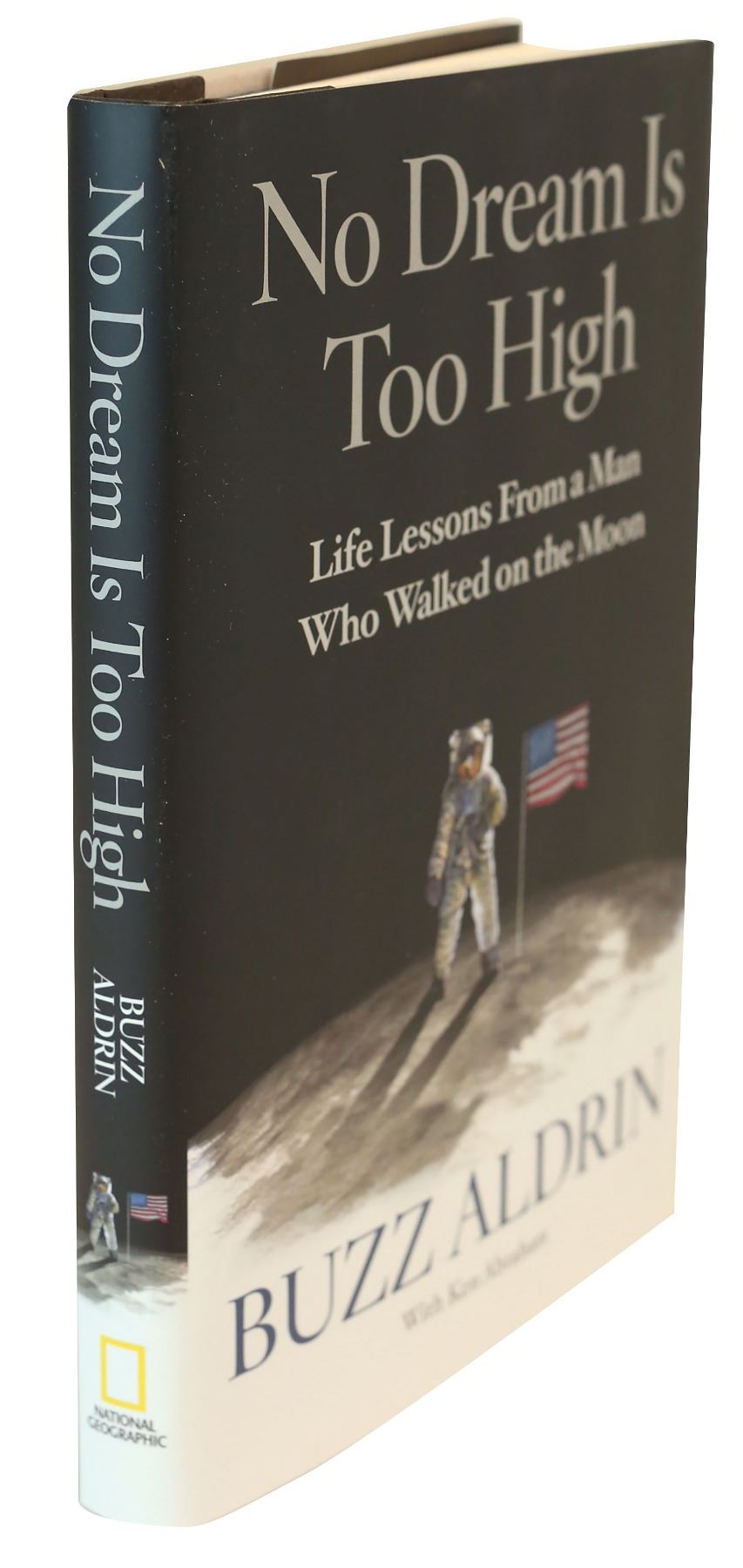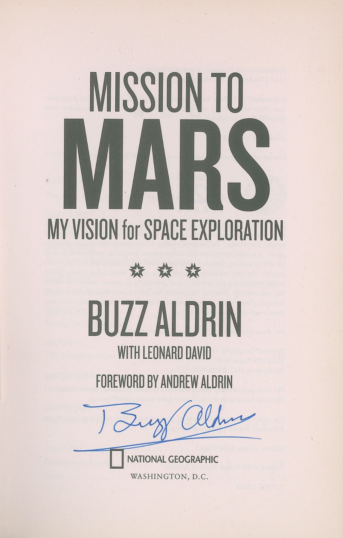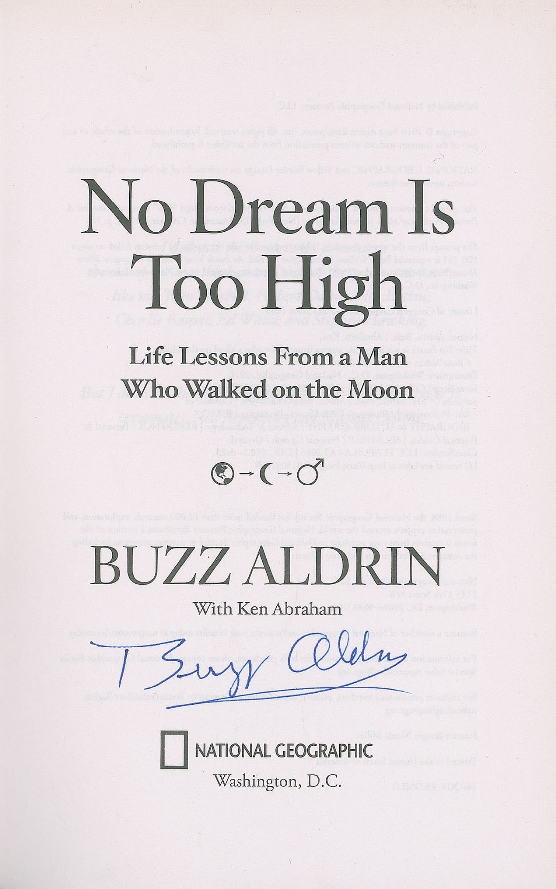 Two books, both hardcover with dust jacket, each signed on the title page in blue felt tip by Buzz Aldrin. Titles are No Dream Is Too High and Mission to Mars. In overall fine condition.