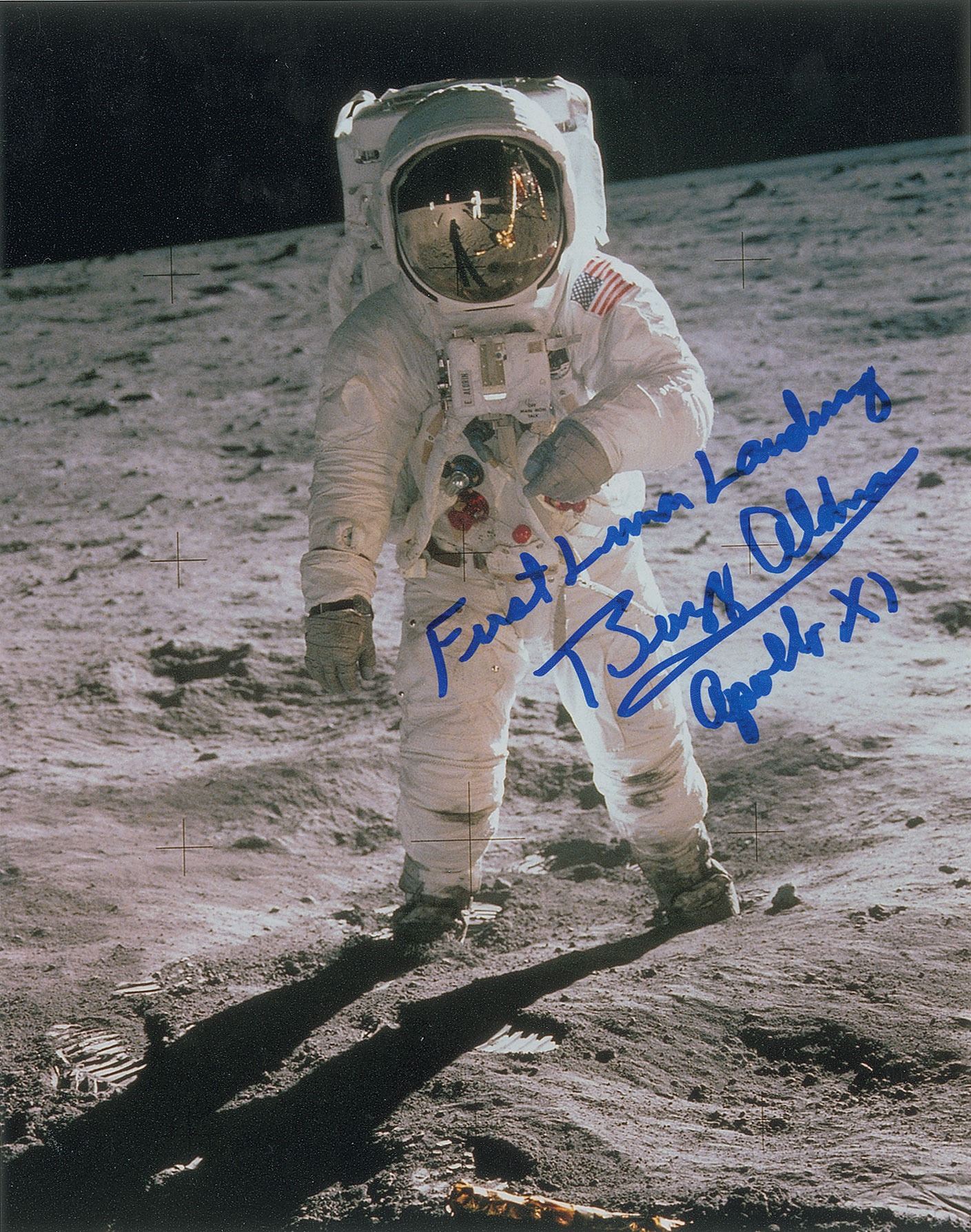 Iconic color satin-finish 8 x 10 photo of LMP Aldrin standing on the lunar surface, his visor showing a small reflection of the photographer, CDR Neil Armstrong, signed in blue felt tip, "First Lunar Landing, Buzz Aldrin, Apollo XI." In very fine condition.