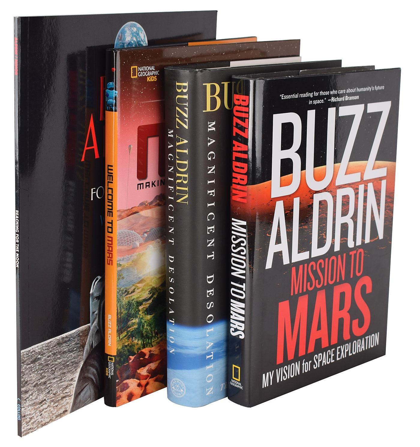 Four books signed on an opening page in ink or felt tip by Apollo 11 astronaut Buzz Aldrin, including: Magnificent Desolation, Mission to Mars: My Vision for Space Exploration (also signed by Leonard David), Reaching for the Moon, and Welcome to Mars: Making a Home on the Red Planet. In overall fine condition.