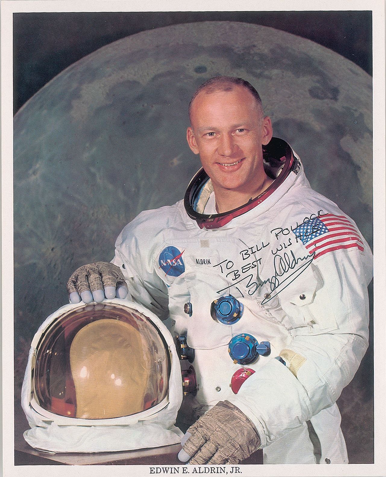 Official color 8 x 10 NASA lithograph of Aldrin posing in his white space suit against a lunar backdrop, secretarially inscribed in black felt tip, "To Bill Pollock, Best Wishes," and signed below, "Buzz Aldrin.” In fine condition.