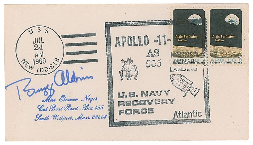 Apollo 11 recovery cover with a stamped cachet honoring the U.S. Navy Recovery Force in the Atlantic, postmarked on the USS New on the return date of July 24, 1969, signed in blue felt tip, "Buzz Aldrin." In fine condition. The USS New was part of the support fleet for the Apollo 11 moon landing, stationed in the launch abort area in the Atlantic Ocean; the crew was ultimately recovered by the USS Hornet upon splashdown in the North Pacific Ocean following their successful moon landing mission.