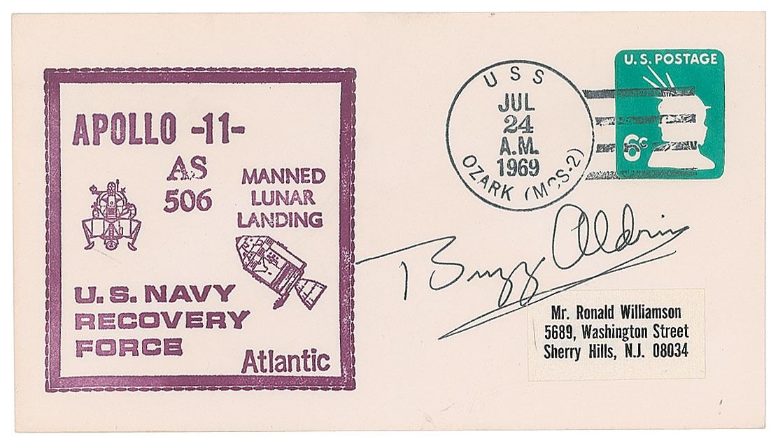 Apollo 11 recovery cover with a stamped cachet honoring the U.S. Navy Recovery Force in the Atlantic, postmarked on the USS Ozark on the return date of July 24, 1969, signed in black felt tip, "Buzz Aldrin." In fine condition. The USS Ozark was part of the support fleet for the Apollo 11 moon landing, stationed in the launch abort area in the Atlantic Ocean; the crew was ultimately recovered by the USS Hornet upon splashdown in the North Pacific Ocean following their successful moon landing mission.