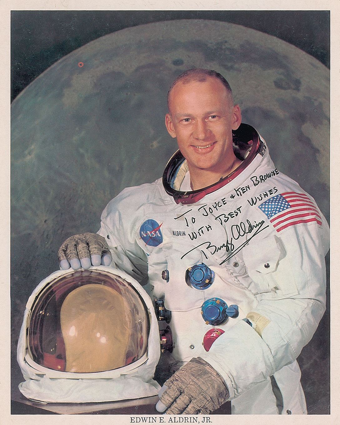 Official color 8 x 10 NASA lithograph of Aldrin wearing his white space suit and posing against a lunar backdrop, signed and inscribed in black felt tip, "To Joyce & Ken Browne, with best wishes, Buzz Aldrin.” Collector's notation on reverse dates the signature to March 16, 1971. In very good to fine condition, with some light surface creasing.