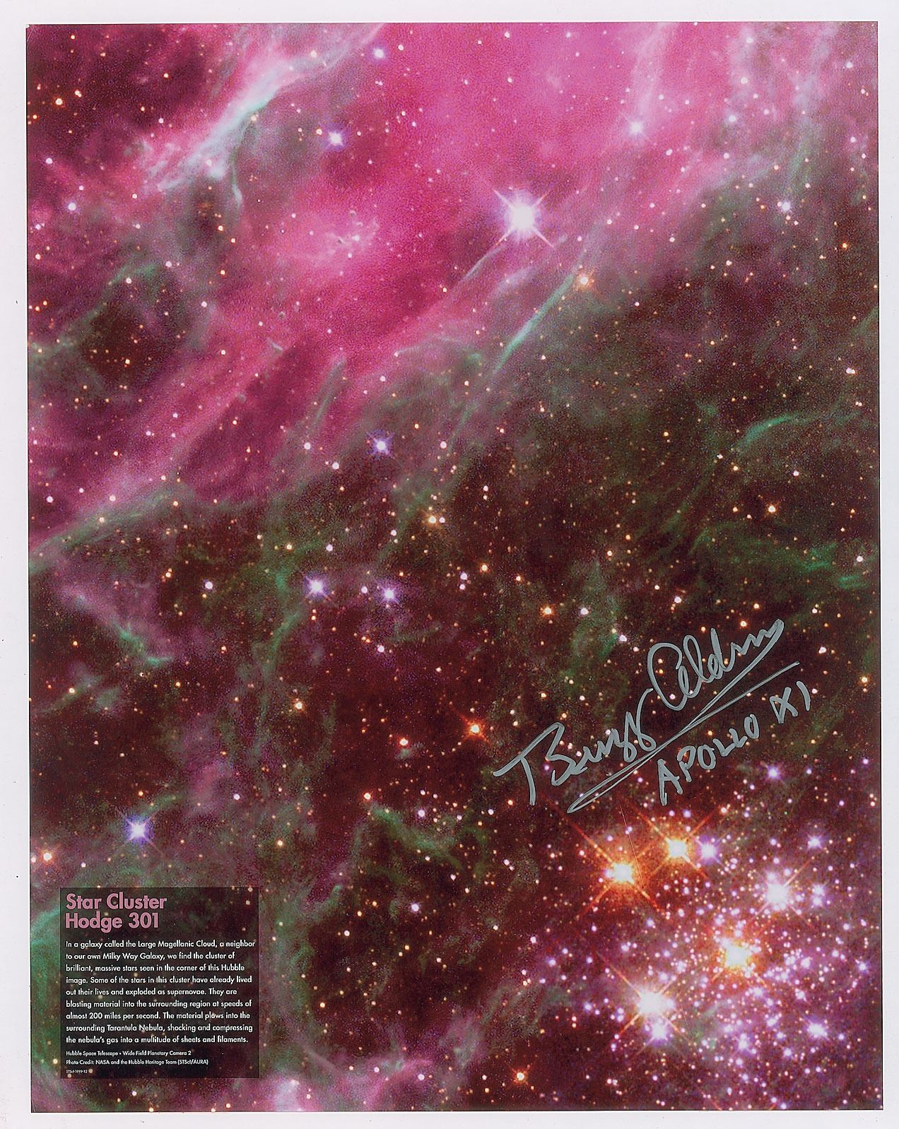 Color glossy 11 x 14 photo of the brilliant Star Cluster Hodge 301 in the Large Magellanic Cloud galaxy, signed in silver ink, "Buzz Aldrin, Apollo XI." In fine condition.