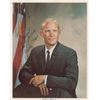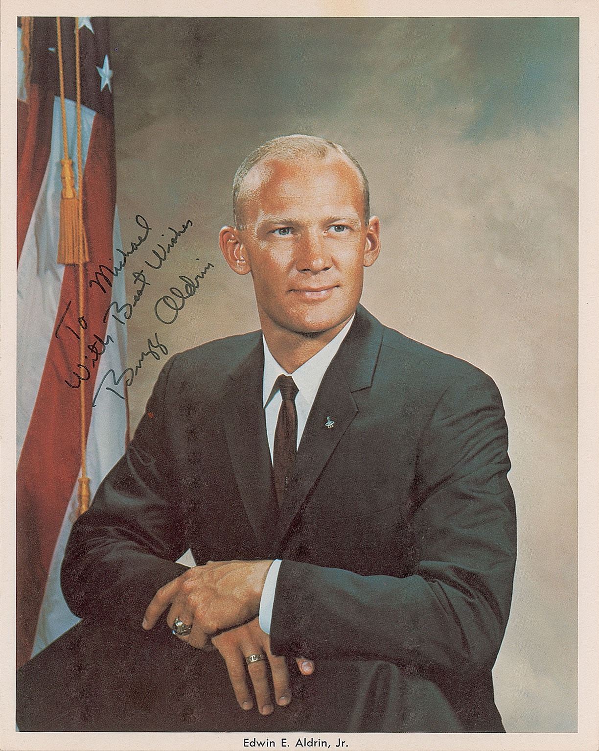 Official color 8 x 10 NASA lithograph of Aldrin wearing a suit and tie and posing next to an American flag, signed and inscribed in black felt tip, "To Michael, with best wishes, Buzz Aldrin.” In fine condition, with adhesive residue on the back from onetime storage in a magnetic photo album.