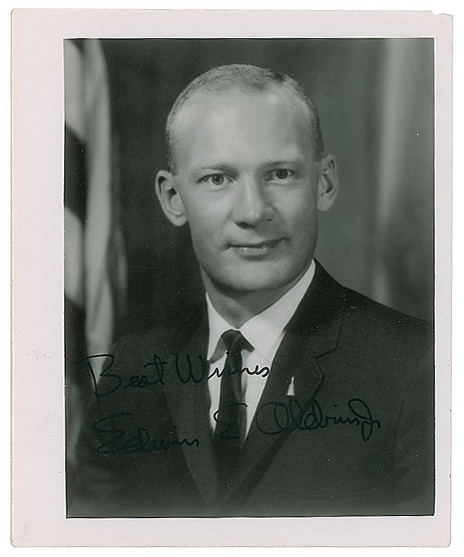 Scarce official glossy 4.25 x 5 NASA photo of Aldrin as a new member of NASA Astronaut Group 3, signed in black ink, "Best wishes, Edwin E. Aldrin, Jr." In fine condition, with poor signature contrast against his dark suit.