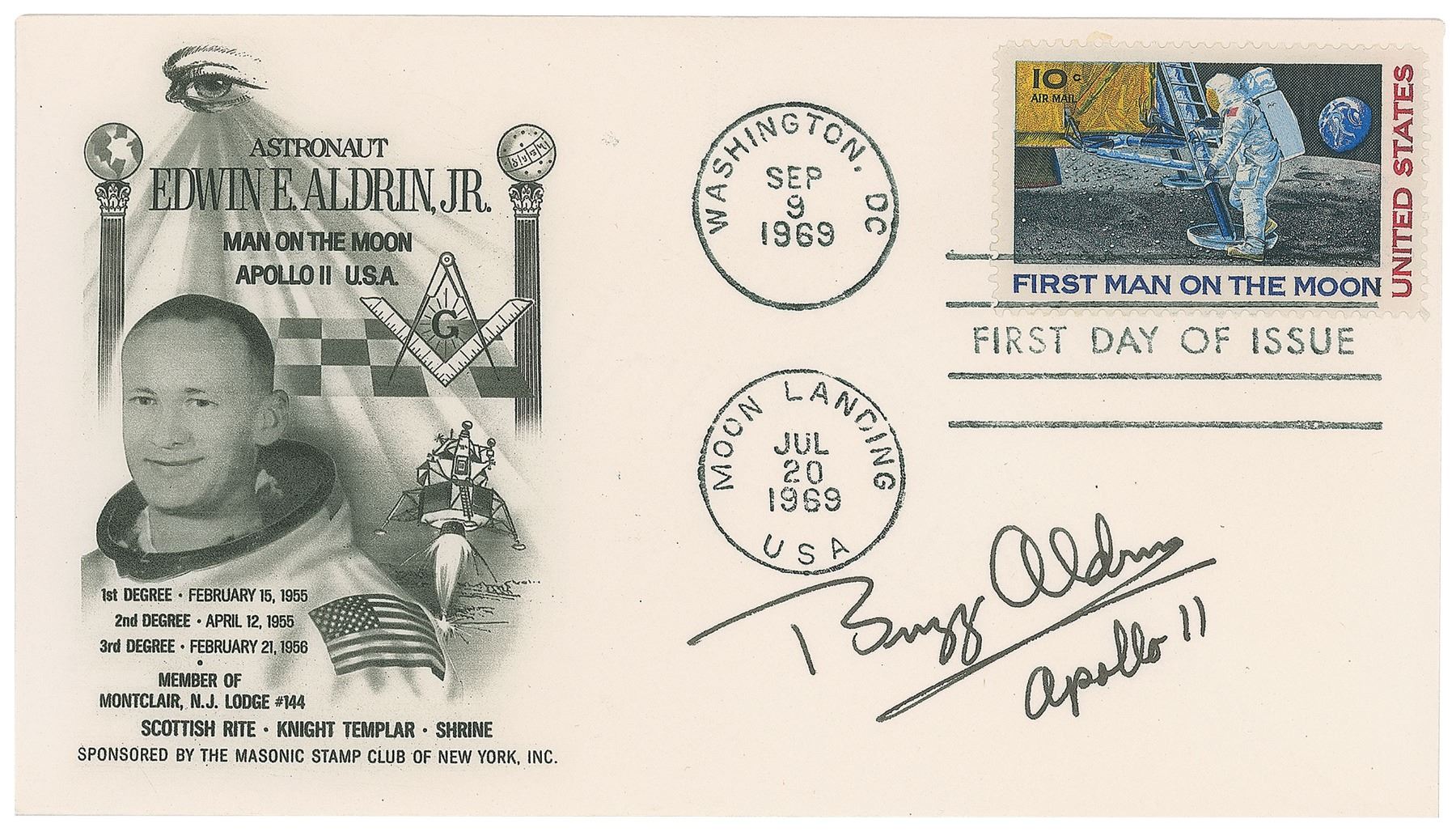 FDC with a cachet honoring Apollo 11 moonwalker Edwin E. Aldrin, Jr., postmarked July 20, 1969, the date of the Apollo 11 moon landing, and September 9, 1969, the issue date for the jumbo-sized commemorative "First Man on the Moon" stamp, which is affixed to the upper right corner, signed in black ink, "Buzz Aldrin, Apollo 11." In very fine condition. Accompanied by a full letter of authenticity from PSA/DNA.