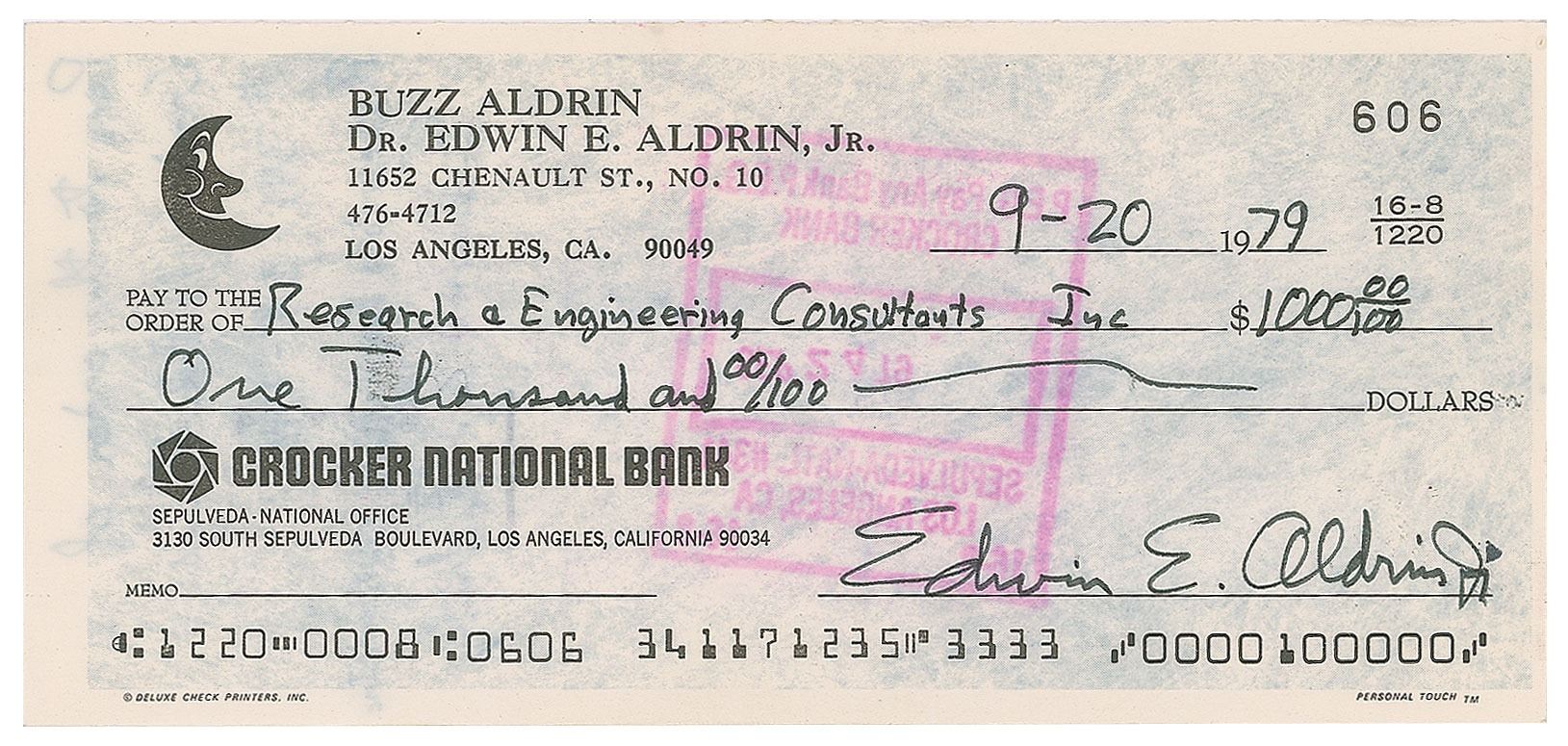 Personal check, 6 x 2.75, filled out and signed by Aldrin, "Edwin E. Aldrin, Jr.," payable to Research & Engineering Consultants, Inc. for $1000, September 20, 1979. The reverse is also endorsed by Aldrin in black ink: "Pay to the order of Crocker Nat'l Bank…Research & Engineering Consultants, Inc., Edwin E. Aldrin, Jr." In fine condition.