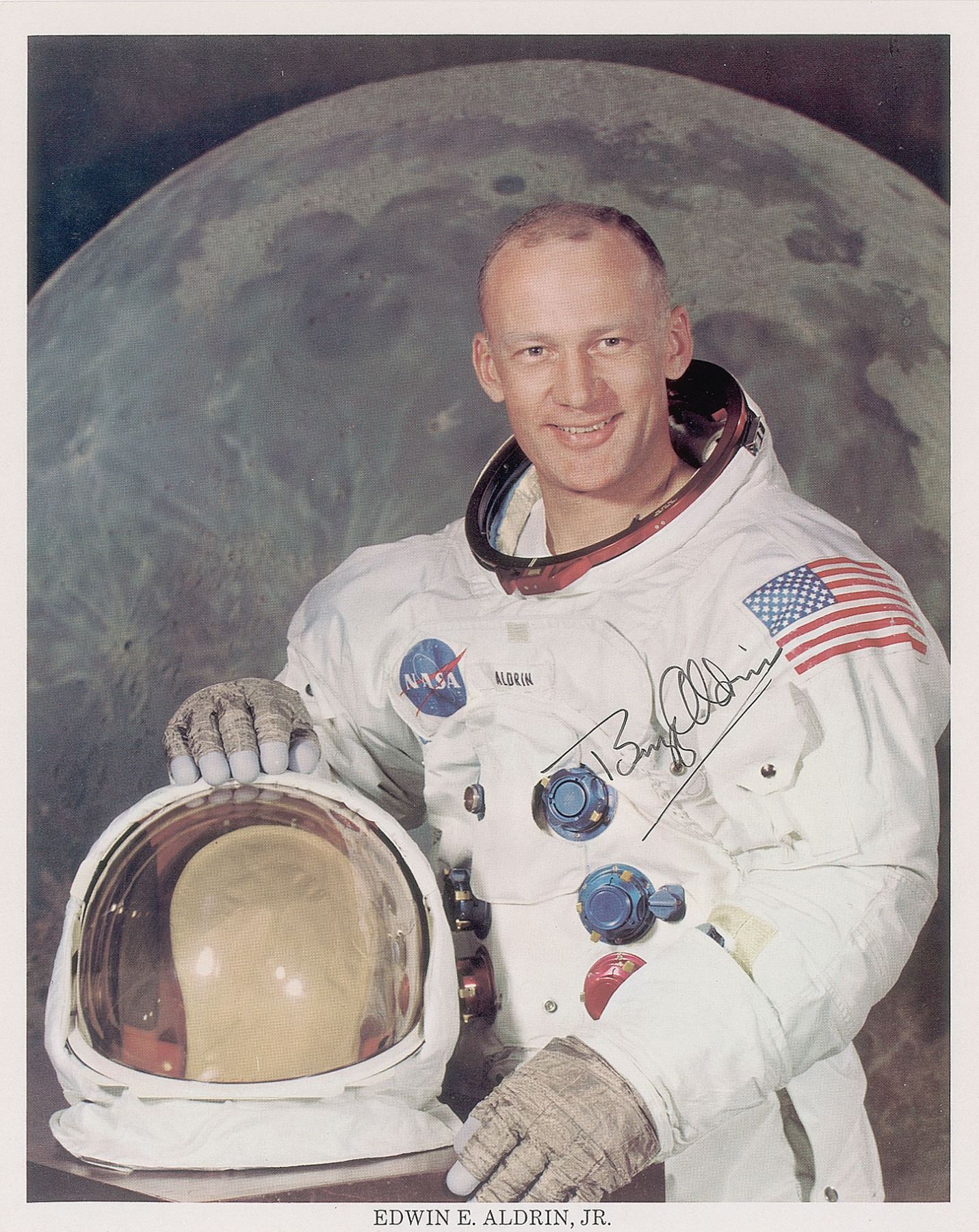 Official color 8 x 10 NASA lithograph of Buzz Aldrin posing in his white space suit against a lunar backdrop, signed in black felt tip. In fine condition, with a few light surface creases. A desirable uninscribed example.
