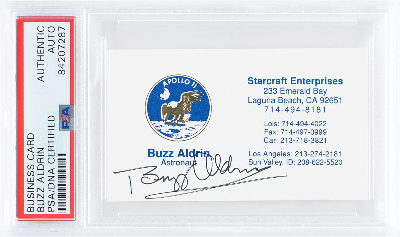 Starcraft Enterprises business card belonging to Buzz Aldrin, 3.5 x 2, with an Apollo 11 insignia and identifying him as "Astronaut," signed in black ink. In fine condition. Encapsulated in a PSA/DNA authentication holder.