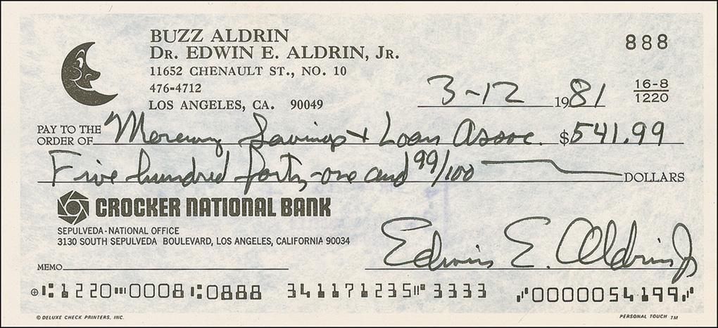 Personal check, 6 x 2.75, filled out and signed by Aldrin, “Edwin E. Aldrin, Jr.,” payable to Mercury Savings & Loan Assoc. for $541.99, March 12, 1981. In fine condition.