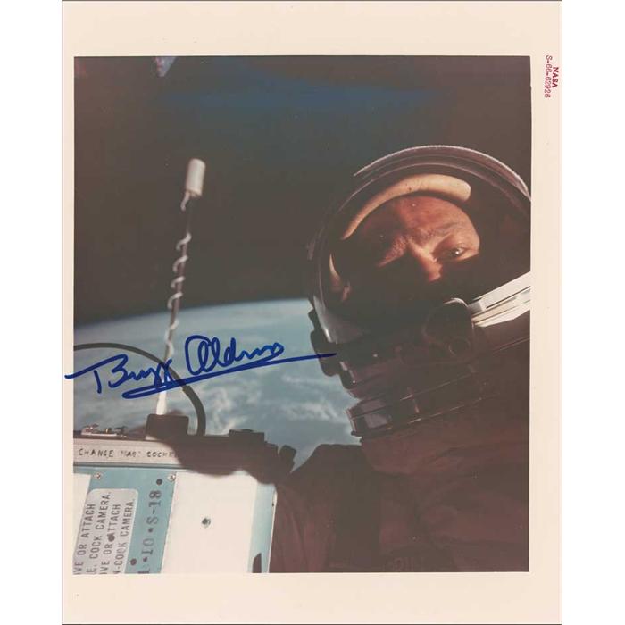 Color 8 x 10 ‘red-lettered’ NASA photo of Aldrin conducting a space walk during the Gemini XII mission, signed in blue felt tip. In very fine condition. Pre-certified Scott Cornish and RRAuction COA.