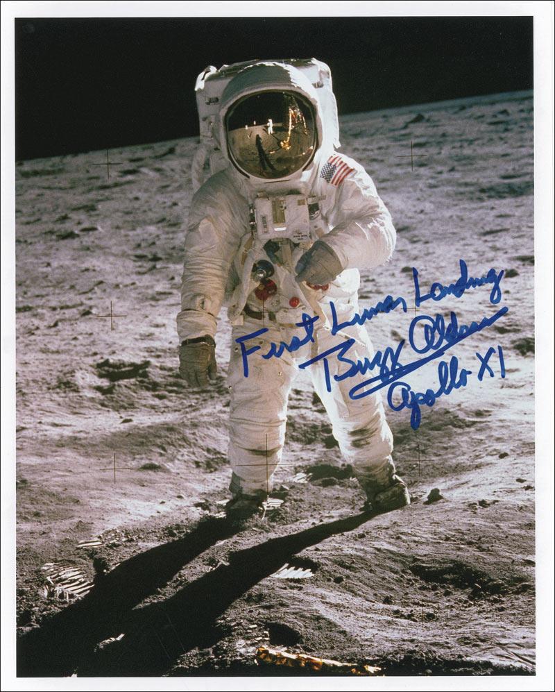 Color satin-finish 8 x 10 photo of Aldrin on the lunar surface, signed in blue felt tip, “First lunar landing, Buzz Aldrin Apollo XI.” In very fine condition. Fantastic image with Aldrin adding the occasion. Pre-certified Scott Cornish and RRAuction COA.