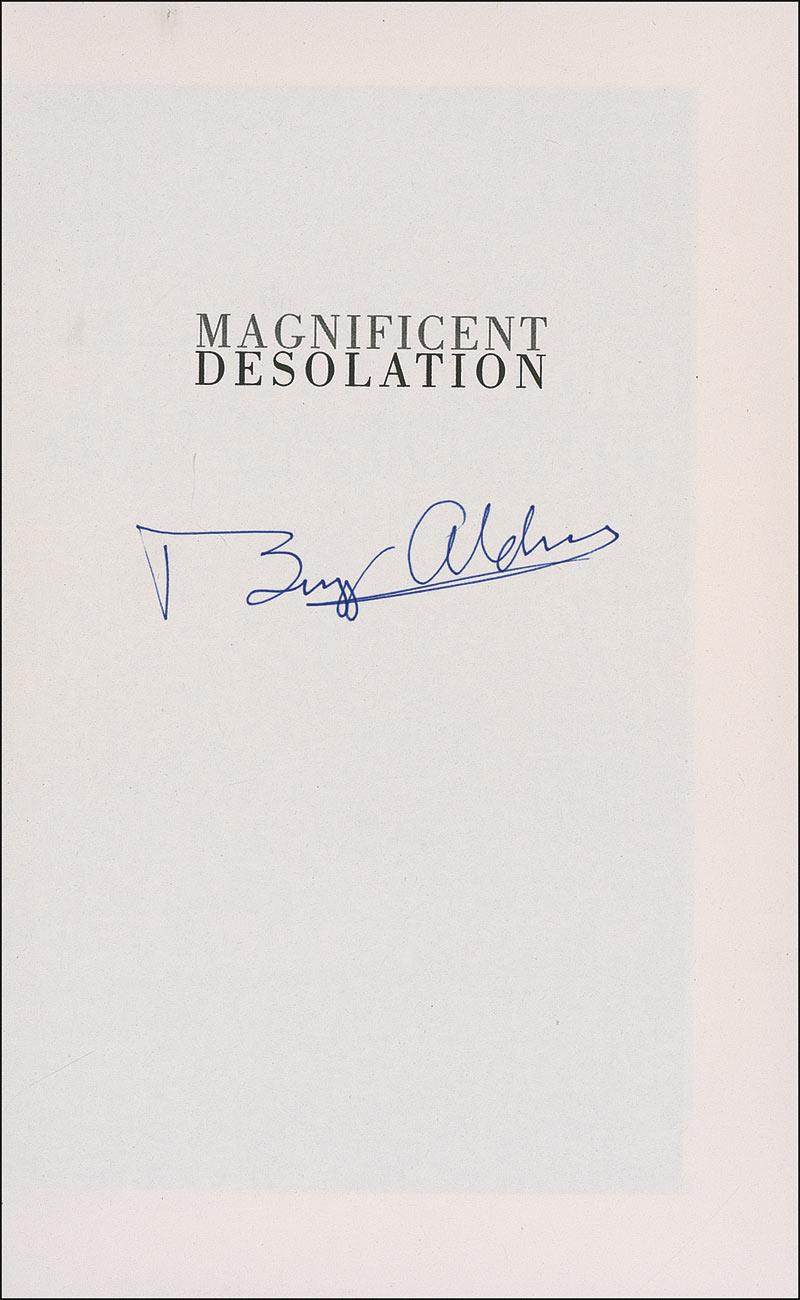 Signed book: Buzz Aldrin: Magnificent Desolation. First edition, later printing. NY: Harmony Books, 2009. Hardcover with dustjacket, 6.5 x 9.5, 326 pages. Signed in blue ink on the half-title page. In fine condition, with some light surface marks to dustjacket. Pre-certified Scott Cornish and RRAuction COA.