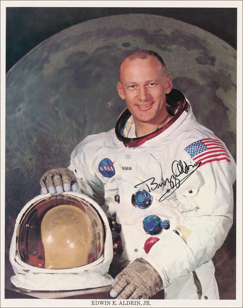 Color 8 x 10 NASA photo of Aldrin in his white space suit posing in front of a lunar background, signed in black felt tip. In fine condition, with a few minor creases. Pre-certified Scott Cornish and RRAuction COA.
