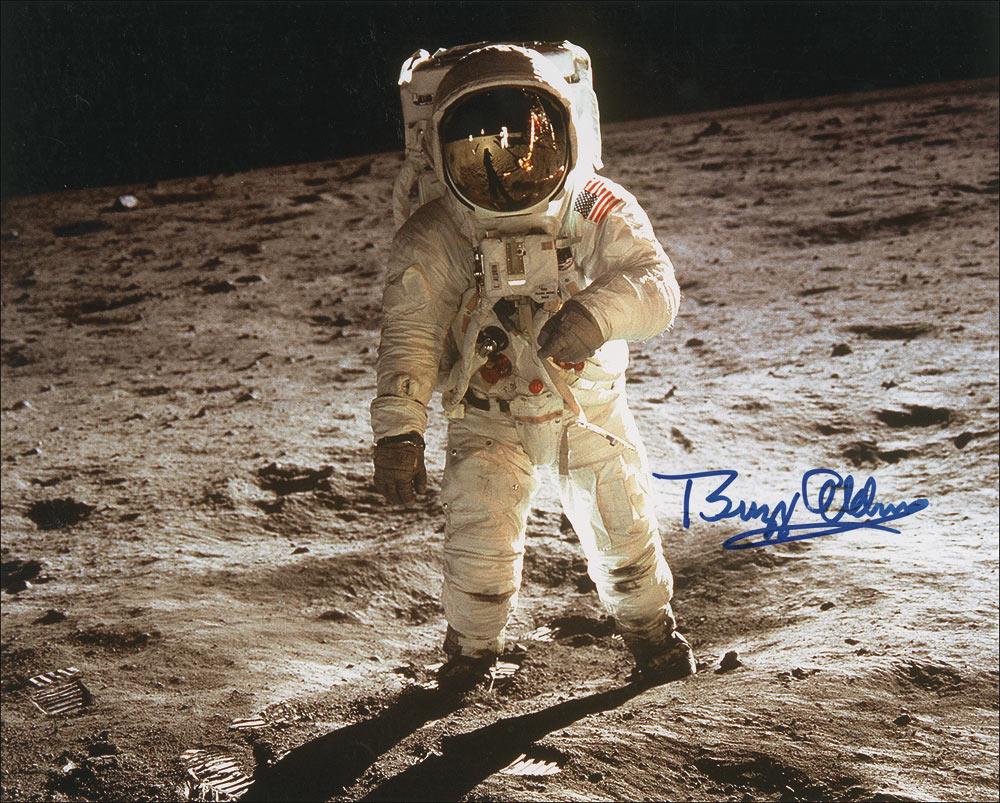 Satin-finish 10 x 8 photo of Aldrin on the lunar surface, signed in blue felt tip. In fine condition, with a few scattered light surface bends and dings. Pre-certified Scott Cornish and RRAuction COA.