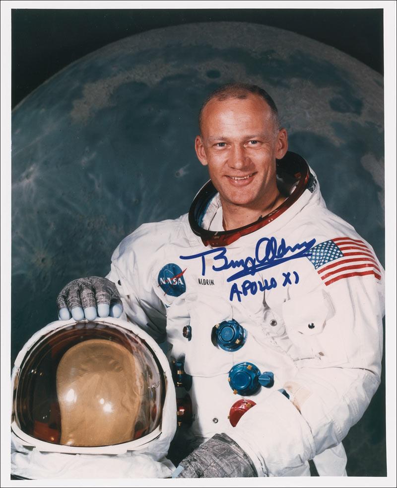 Color satin-finish 8 x 10 photo of Aldrin posing in his spacesuit against a lunar background, signed in blue felt tip, “Buzz Aldrin Apollo XI.” In very fine condition. Pre-certified Scott Cornish and RRAuction COA.