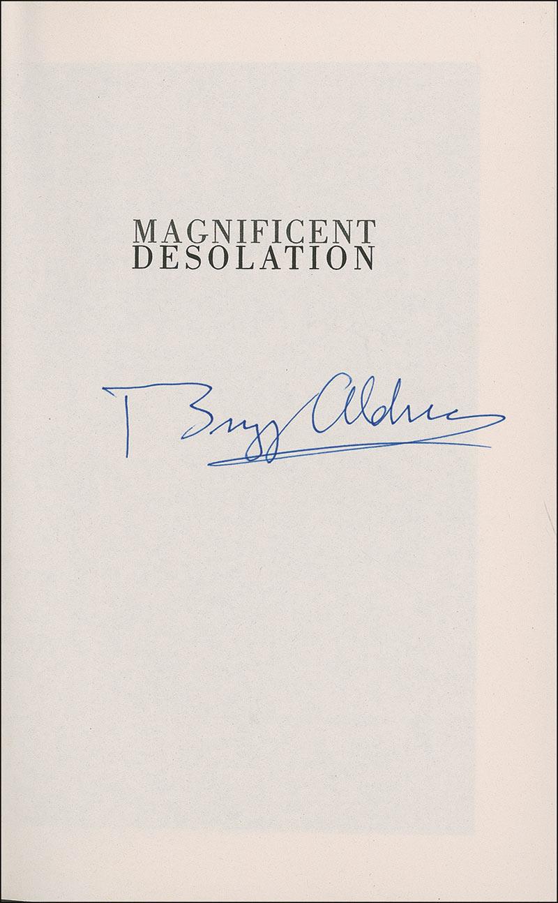 Signed book: Magnificent Desolation. First edition, first printing. NY: Harmony Books, 2009. Hardcover with dustjacket, 6.5 x 9.5, 326 pages. Signed on the half-title page in blue ink. In very fine condition. Pre-certified Scott Cornish and RRAuction COA.