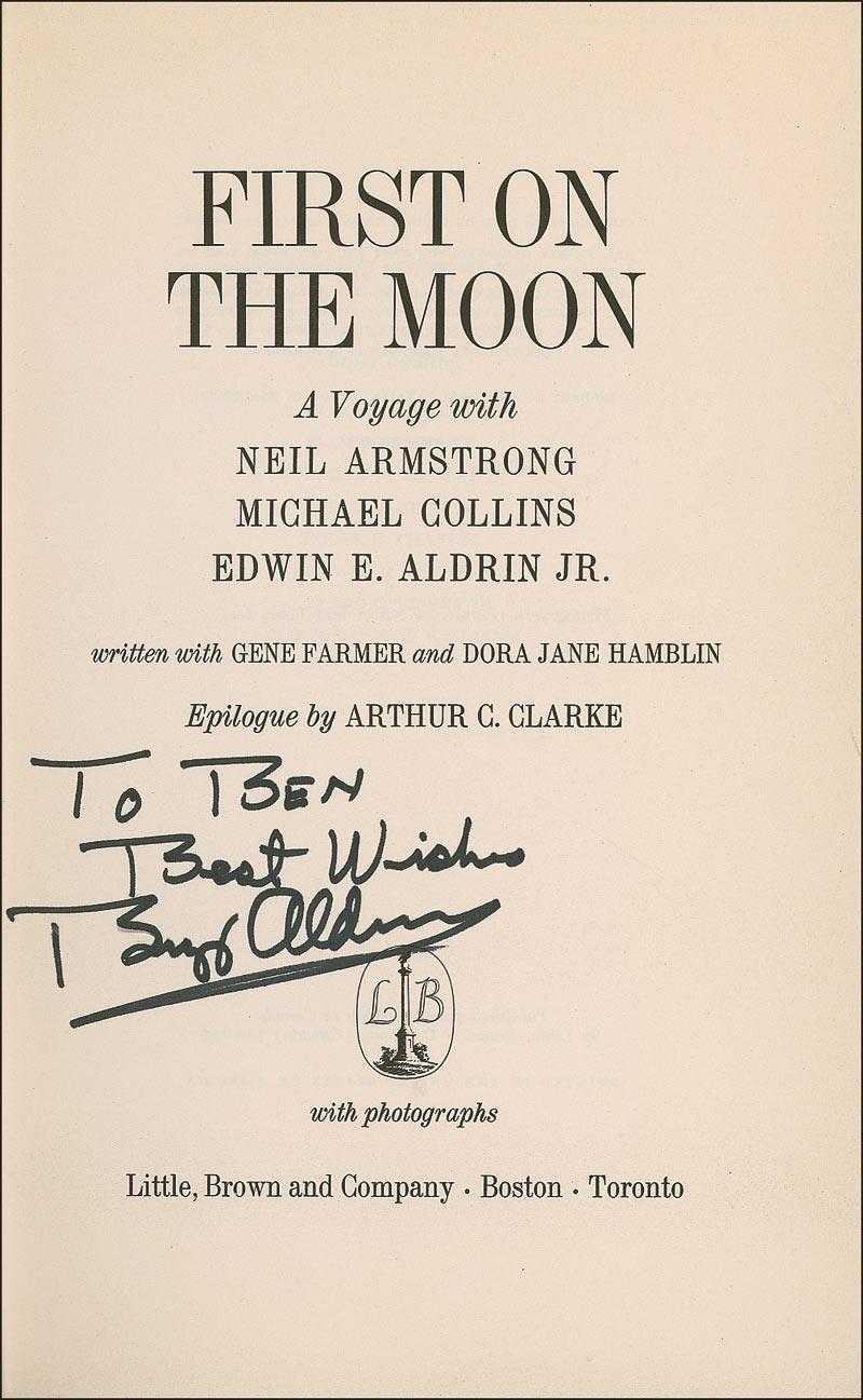 Signed book: First on the Moon. First edition, first printing. Boston: Little, Brown, and Company, 1970. Hardcover with dustjacket, 6.5 x 9.5, 434 pages. Signed and inscribed in black felt tip on the title page, “To Ben, Best wishes, Buzz Aldrin.” A uniform shade of light toning to signed page, light wear and corner bumps to covers, and scattered creasing and a few tears to dustjacket, otherwise fine condition. Pre-certified Scott Cornish and RRAuction COA.