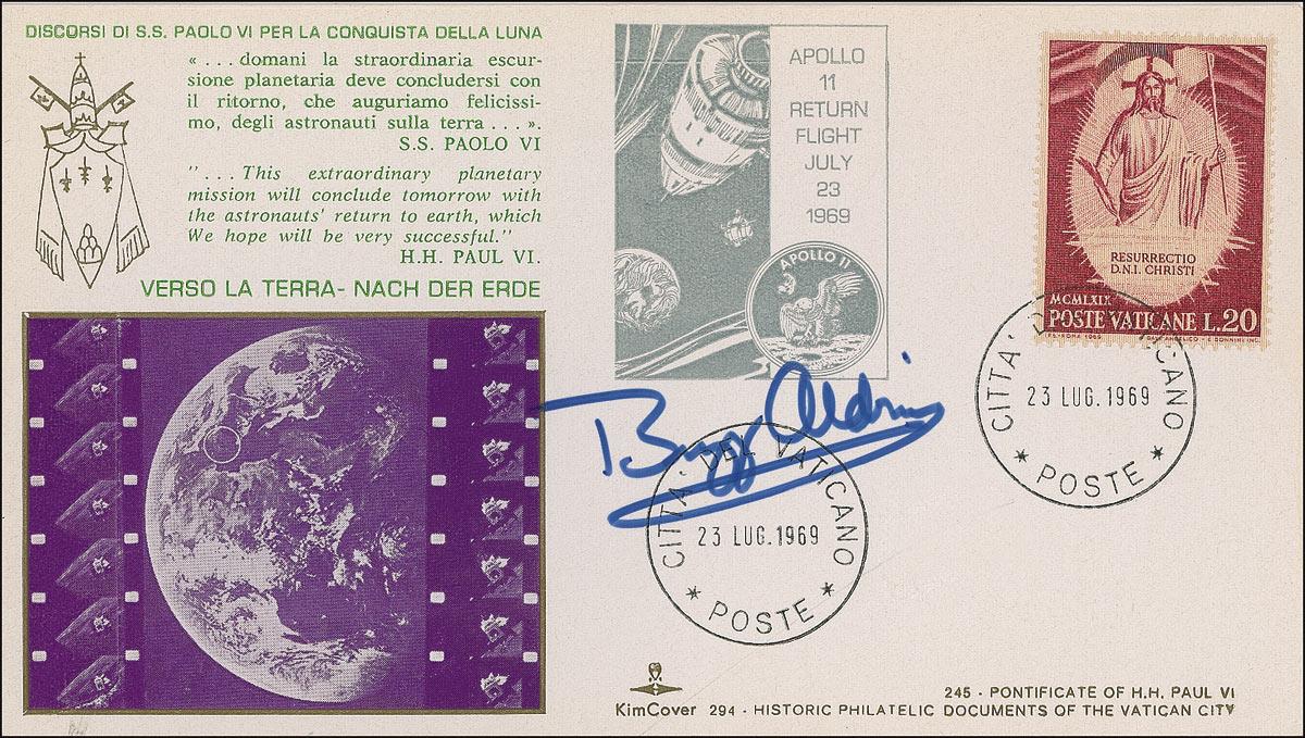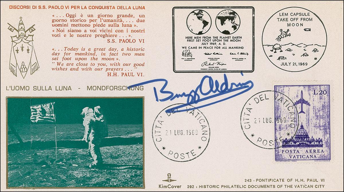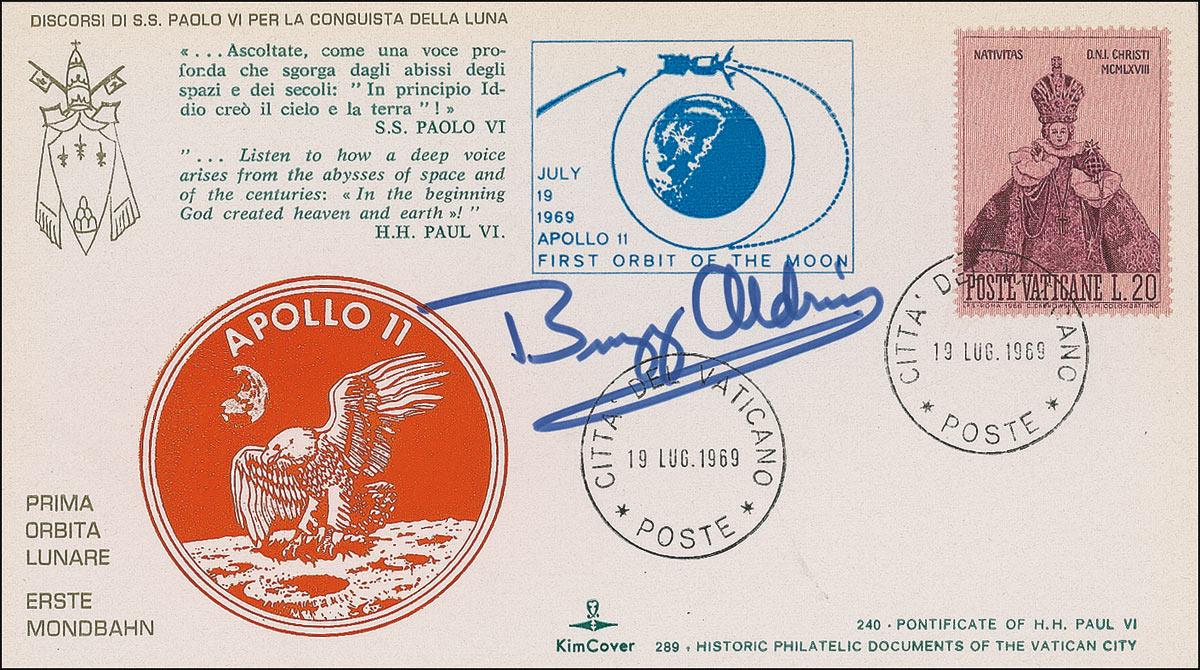 Three different Italian commemorative covers, each with cachets honoring the Apollo 11 mission, each also bearing a July 21, 1969, Vatican cancellation, each signed in blue felt tip by Aldrin. In fine condition. Pre-certified Scott Cornish and RRAuction COA.