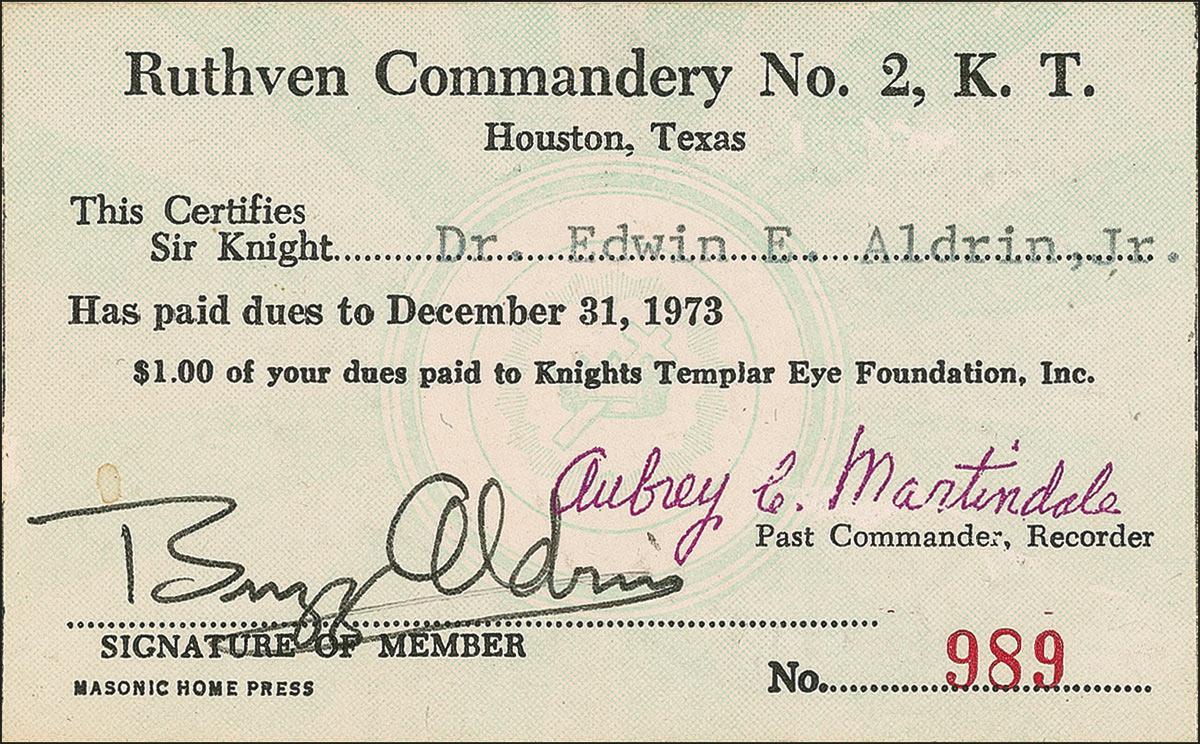 Aldrin’s membership card to the Ruthven Commandery No. 2, K[nights] T[emplar], 3.75 x 2.25, indicating Aldrin has paid his dues to December 31, 1973, signed at the bottom in black ink. In fine condition, with expected handling wear.