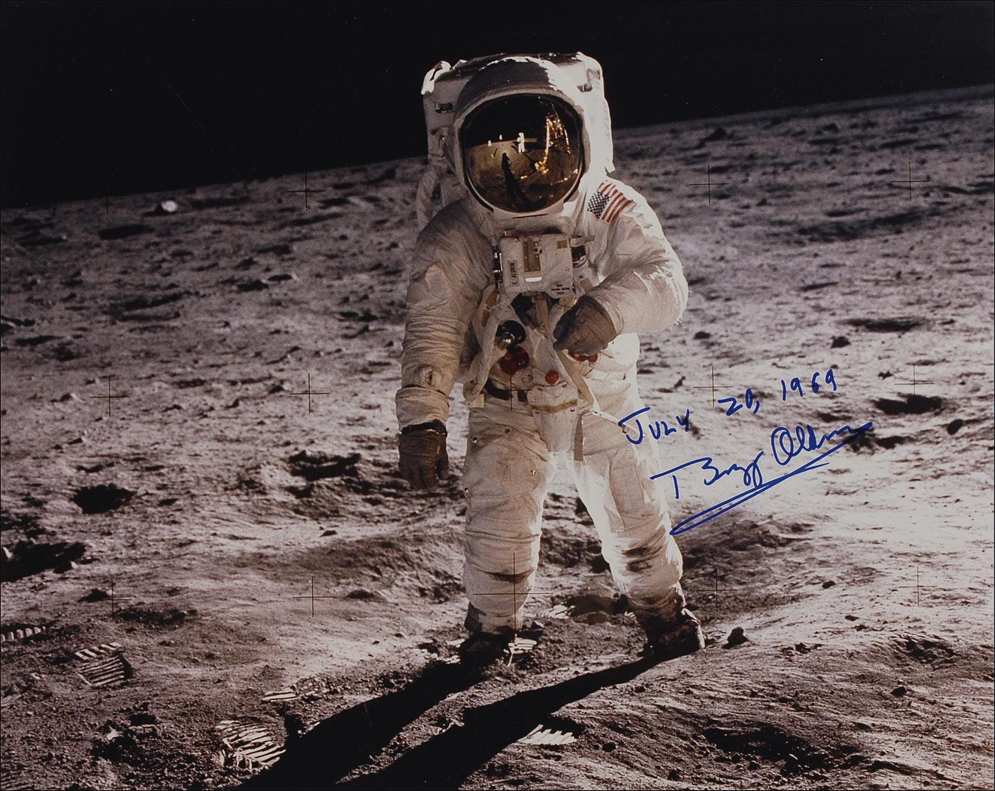 Breathtaking color satin-finish 20 x 16 photo of Aldrin standing on the lunar surface, signed in blue felt tip, “July 20, 1969, Buzz Aldrin.” In very fine condition. Item is aligned to the renowned exhibition ‘Images of Apollo’ running at the Kansas Cosmoshpere.