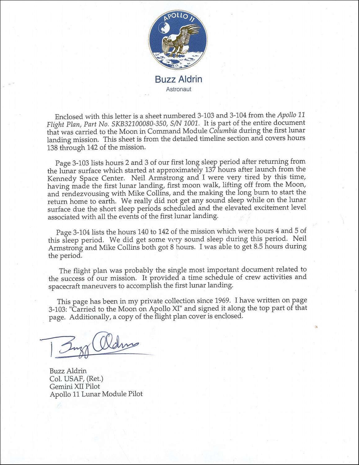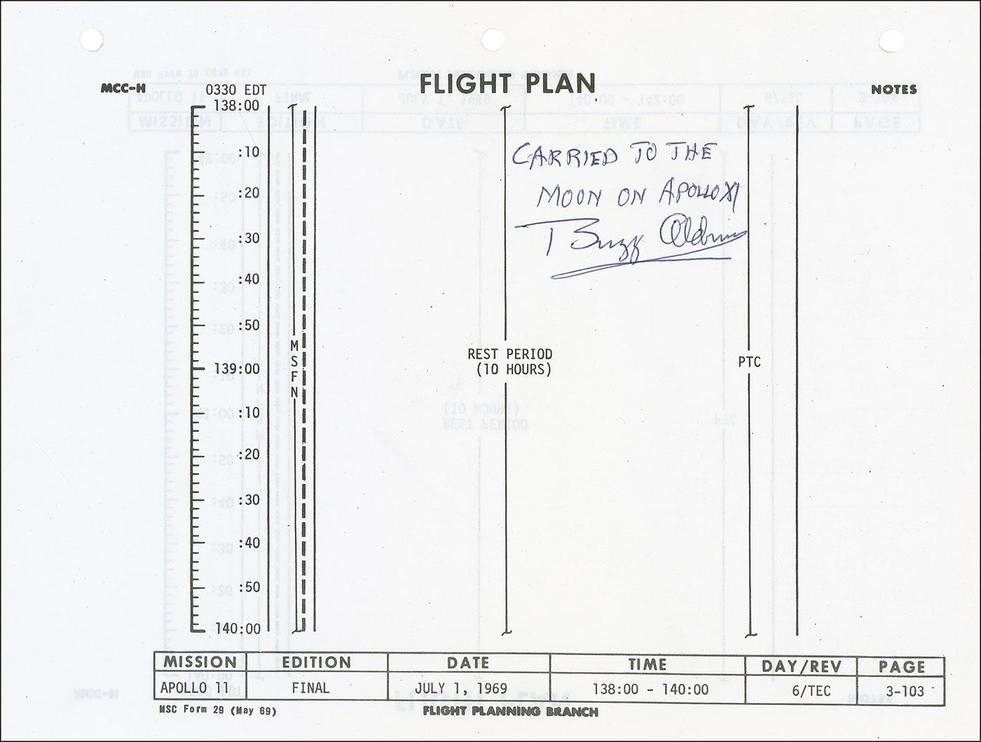 Original printed page from the flight plan flown and used on the Apollo 11 mission, one page both sides, 10.5 x 8, signed in ballpoint, “Carried to the moon on Apollo XI, Buzz Aldrin.” Also included is an undated TLS, signed “Buzz Aldrin,” explaining the purpose and provenance of the item. In part: “Enclosed with this letter is a sheet numbered 3-103 and 3-104 from the Apollo 11 Flight Plan…. It is part of the entire document that was carried to the moon in Command Module Columbia during the first lunar landing mission. This sheet is from the detailed timeline section and covers hours 138 through 142 of the mission. Page 3-103 lists hours 2 and 3 of our first long sleep period after returning from the lunar surface which started at approximately 137 hours after launch from the Kennedy Space Center. Neil Armstrong and I were very tired by this time, having made the first lunar landing, first moon walk, lifting off from the Moon, and rendezvousing with Mike Collins…. We really did not get any sound sleep while on the lunar surface…. Page 3-104 lists the hours 140 to 142 of the mission which were sleep hours 4 and 5…. We did get some very sound sleep during this period…. This page has been in my private collection since 1969….” In very fine condition, with three punch holes along top edge. Rare opportunity for Apollo 11 flight-flown material with astronaut provenance, as items flown on the first moon mission are difficult to come by and are highly desired by space collectors.