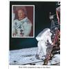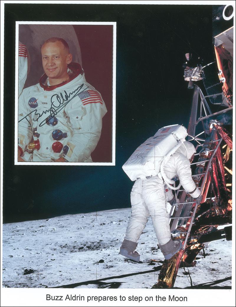 Color 3 x 5 photo of Aldrin in his white space suit, signed in black felt tip, “Buzz Aldrin,” and affixed to a color 8.5 x 11 photo of Aldrin descending the lunar lander to the moon’s surface. In very fine condition.