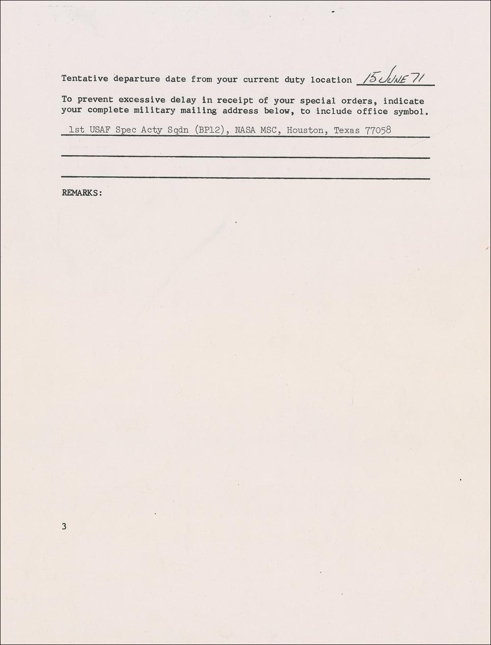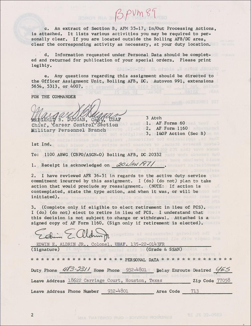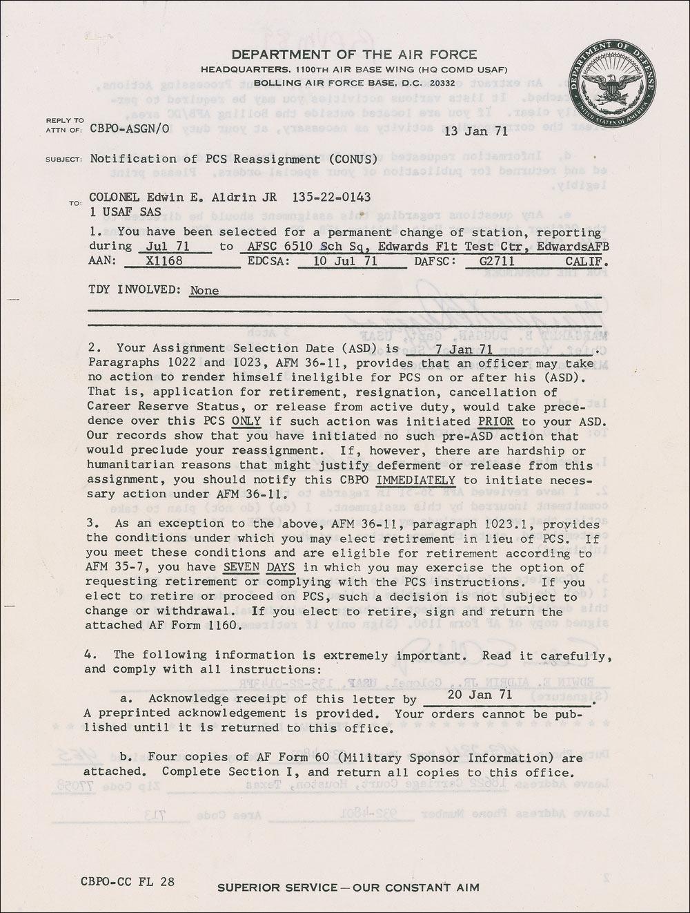 DS, signed “Edwin E. Aldrin, Jr.,” two pages, 8.5 x 11, January 13, 1971. Reassignment papers informing Aldrin he is being transferred from the 1st USAF Acty Squadron at NASA in Houston to the Flight Test Center at Edwards Air Force Base in California. The transfer is to go into effect in June. Filled out in another hand and signed on the reverse of the first page in black ballpoint by Aldrin. In fine condition, with a couple small office notations.