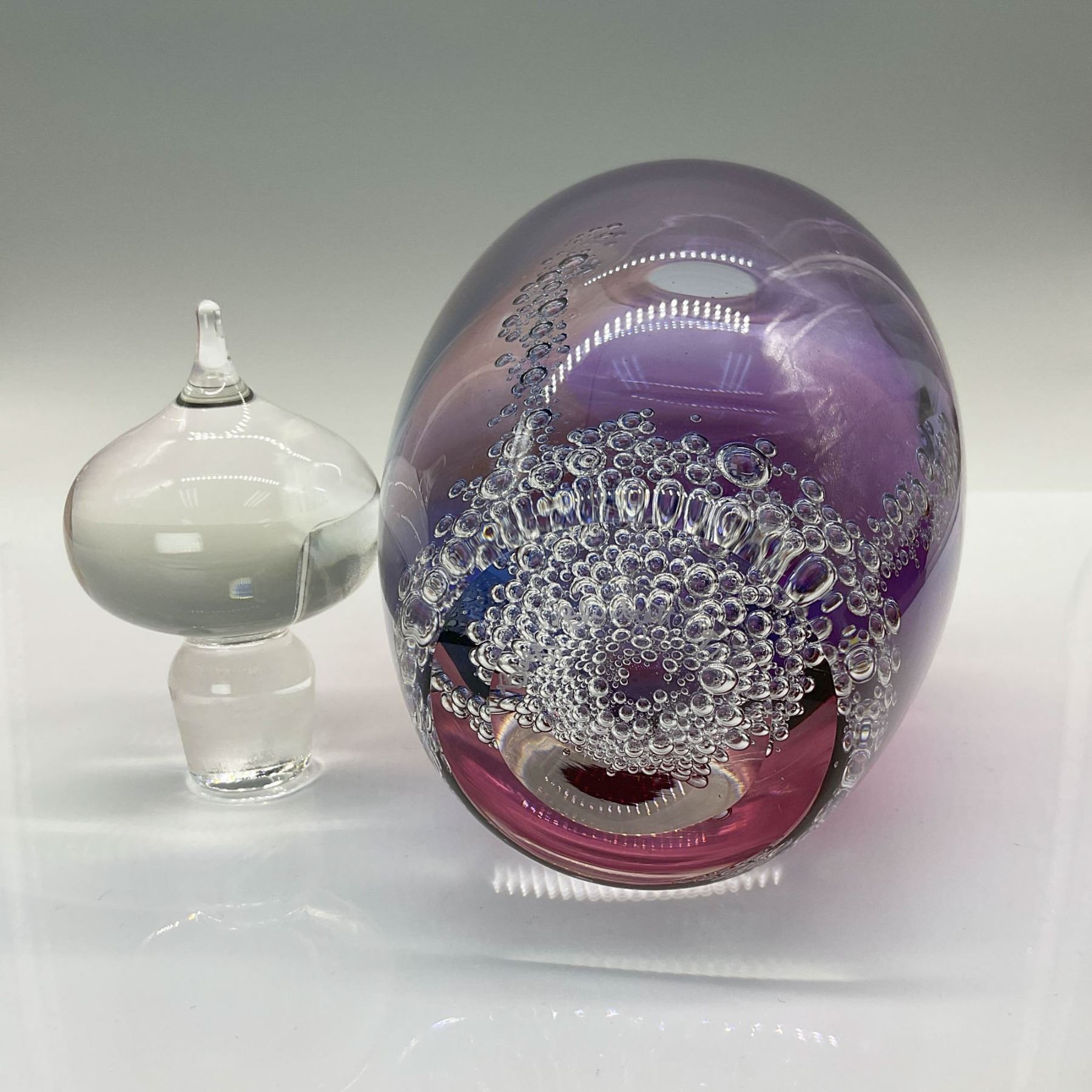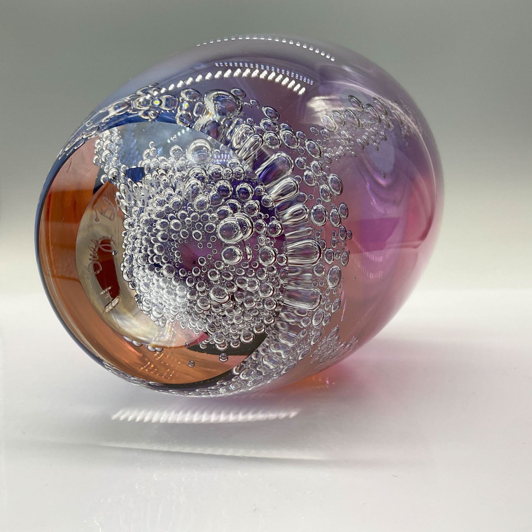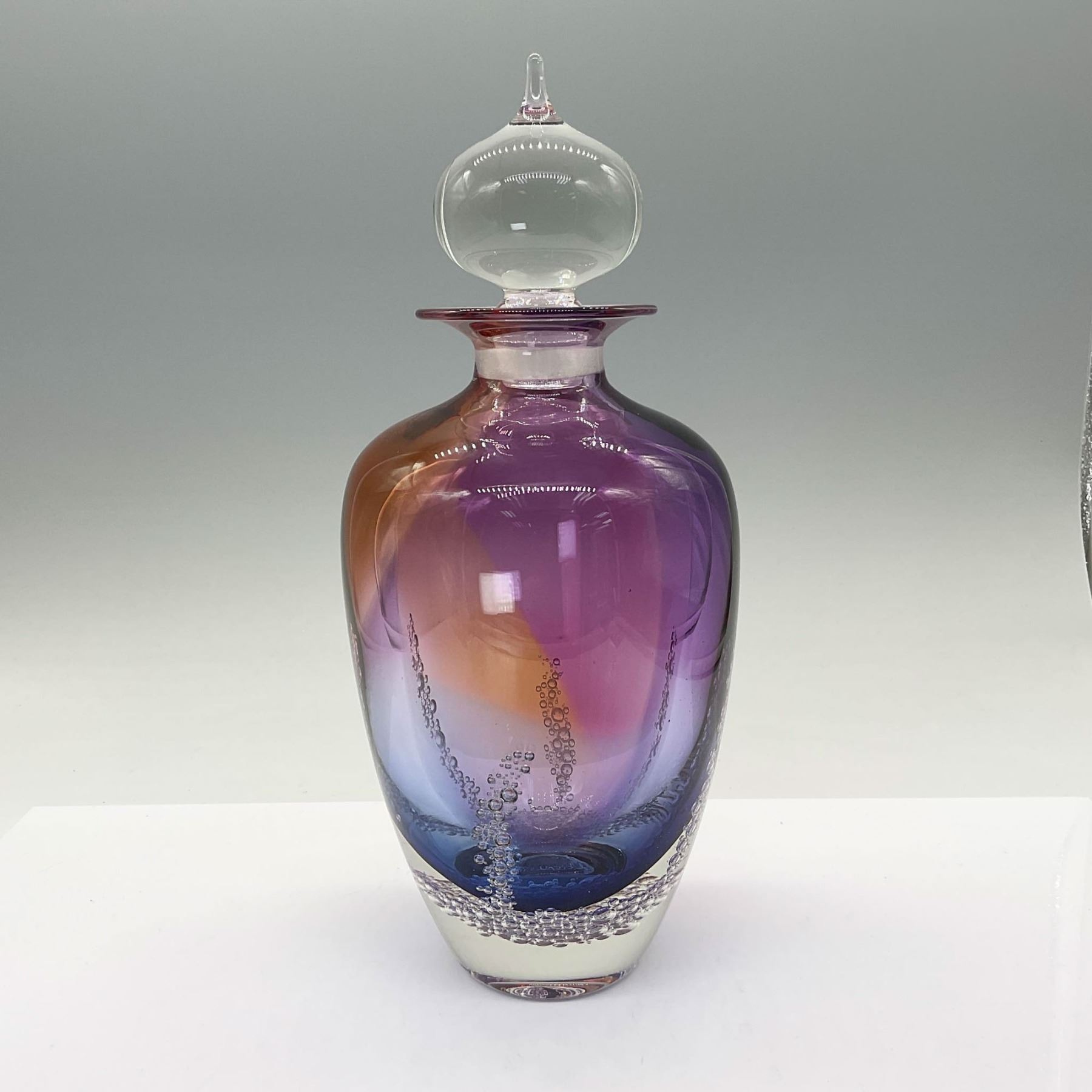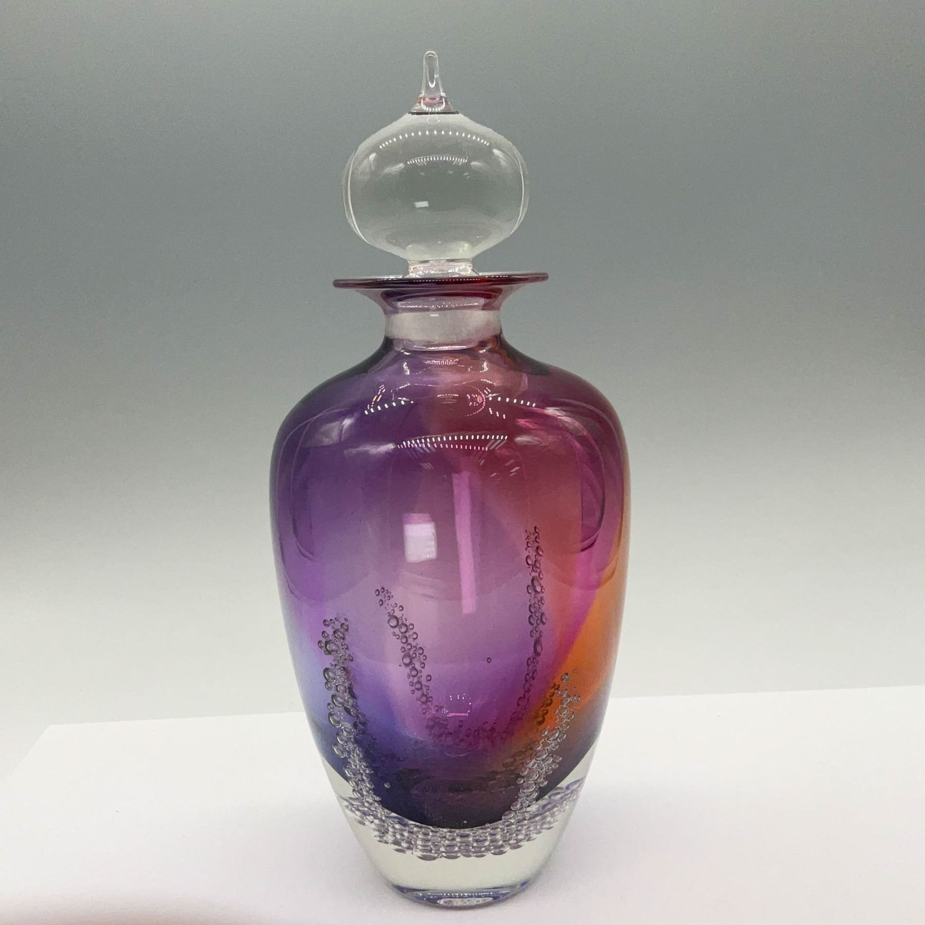 This stunning bottle showcases beautiful orange and purple swirls of glass, complemented by a captured bubble design, graceful flared neck, and an elegant stopper, making it a striking work of art. Created by Buzz Blodgett of Blodgett Glass, a renowned glassblower with over 50 years of experience, this piece reflects his mastery and passion for blending artistic glass techniques with his coastal California roots. Artist signed on base.