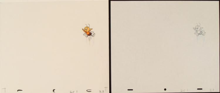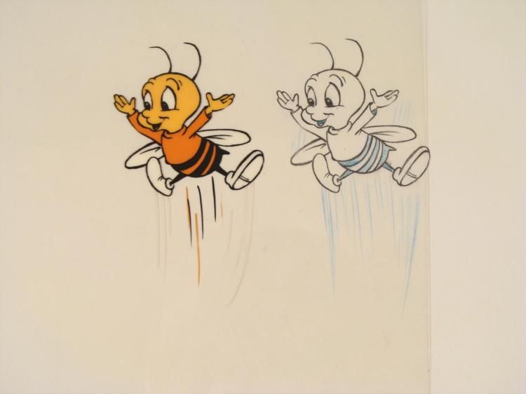 Here, it appears that Buzz is flying through the sky. This is an original animation cel & drawing from the production of the Cheerios cereal commercial.Medium: Hand painted acetate cel with drawingCel size: 10 1/2 x 12 1/2 inchesDrawing size: 10 1/2 x 12 1/2 inchesDetails: Number and peg holes at the bottom edgeCondition: Very goodPencil color: non-photo blue and black
