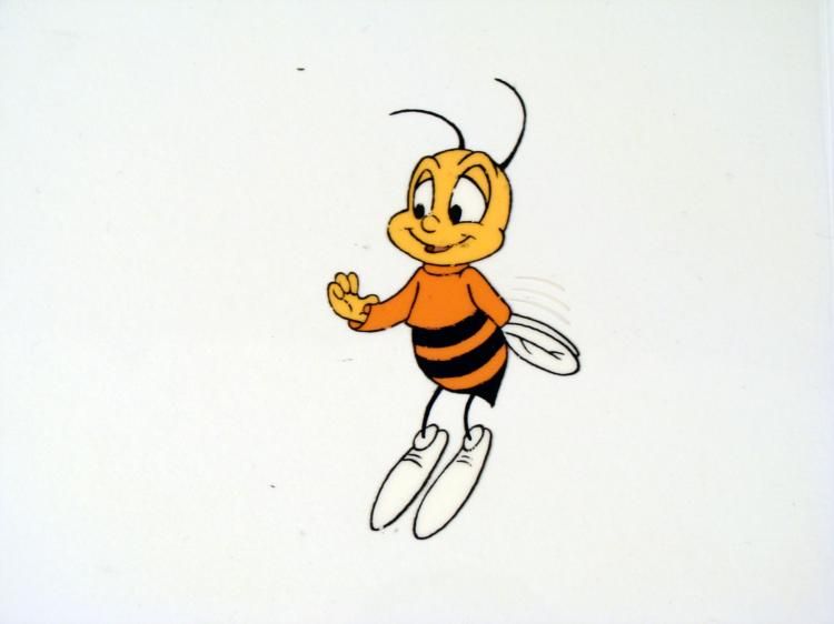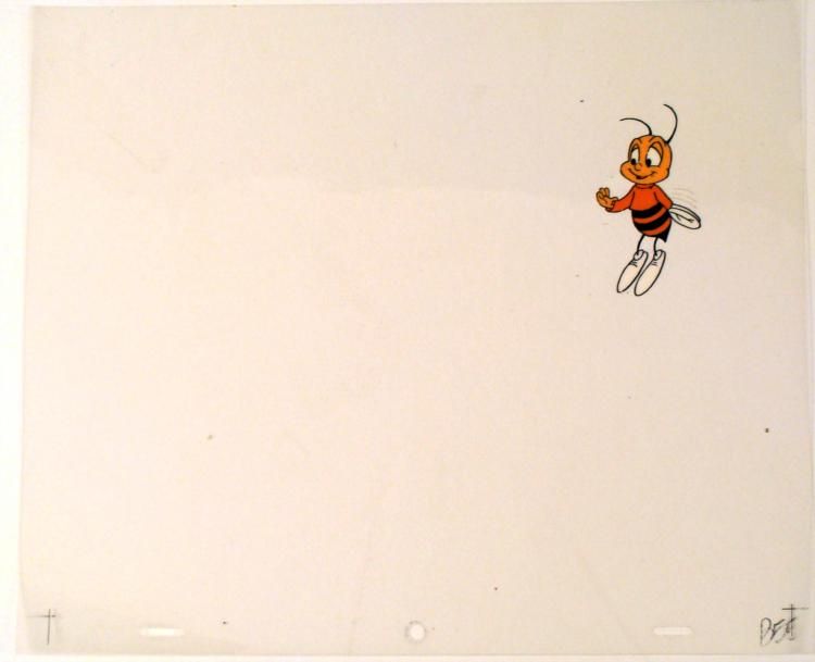 I'm a honey bee * * * Original Animation Cel * * Medium: Hand painted acetate celDetails: Animation notations and peg holesSize of cel: 10 1/2 x 12 1/2 inchesCondition: Very good * * * This is an original hand-painted cel set-up used in the production of the "Honey Nut Cheerios Commercial." Each one-of-a-kind set-up represents a slight change in position of the characters. When individually photographed and projected in rapid succession, * the images appear to move. To created production cels, the original animator's drawing is transferred onto an acetate cel (by hand-inking and/or photo copying). The cel is then hand-painted on the reverse side. * * *