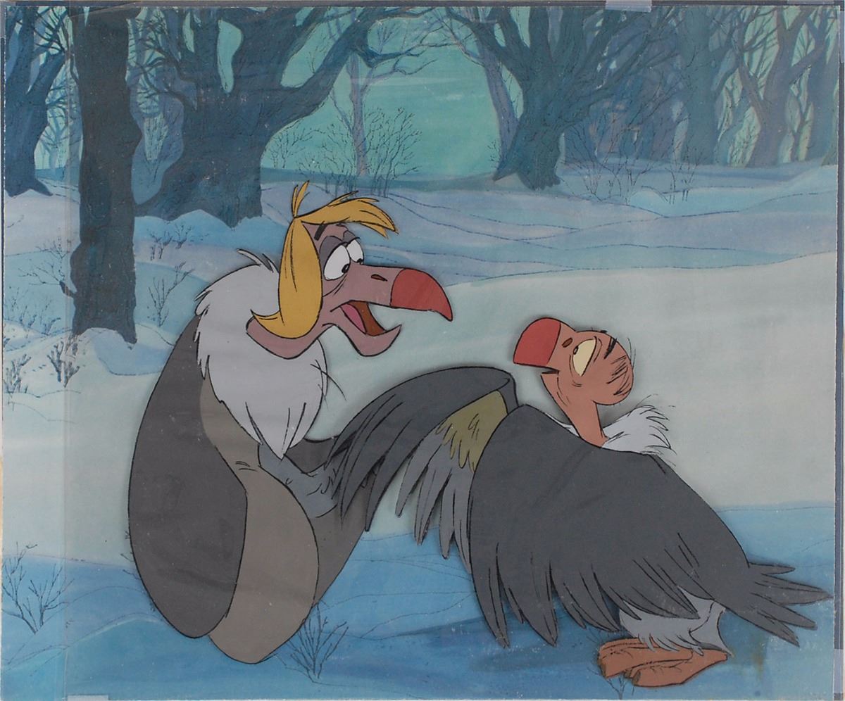 (Walt Disney Studios, 1967) Original production cel featuring Buzzie and Dizzy from The Jungle Book. The cel is placed on a Disneyland litho background. The cel is trimmed to 11 x 10. Total image measures 10 x 7, with overall dimensions of 12 x 10. Reverse of the backing bears a gold label stating that it is an original hand-painted celluloid actually used in a Walt Disney production, and was released exclusively at Disneyland. In fine condition. The Jungle Book’s quartet of singing vultures—Buzzie, Flaps, Ziggy, and Dizzy—were modeled after The Beatles.