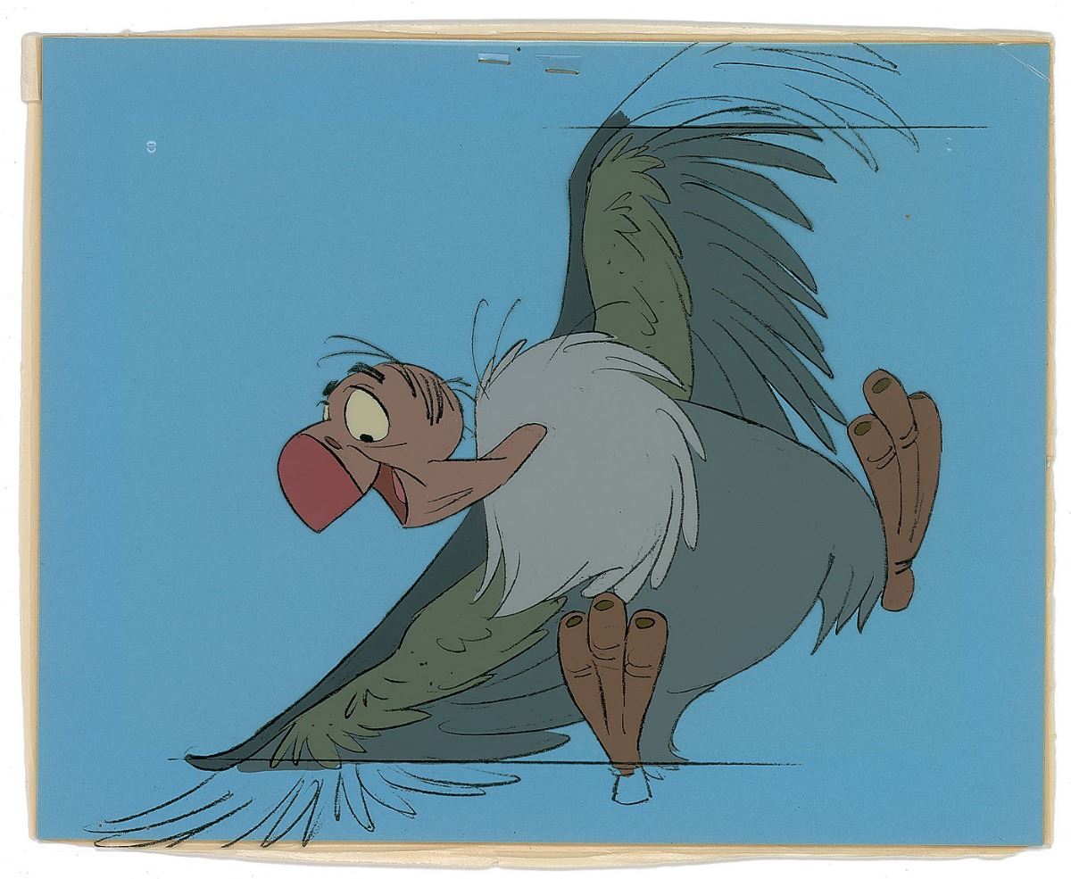 (Walt Disney Studios, 1967) Original production cel featuring Buzzie from The Jungle Book, depicting the vulture happily flapping in midair. Image measures 8.75 x 8. The cel is trimmed to 10 x 8, and stapled to a cardstock backing bearing a gold label on the reverse stating that it is an original celluloid actually used in a Walt Disney production. In fine condition.