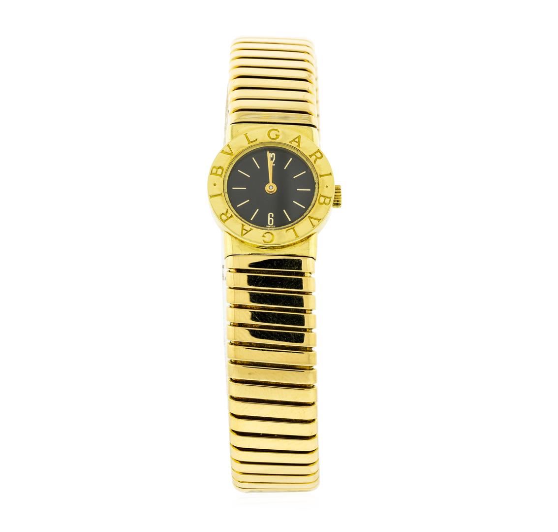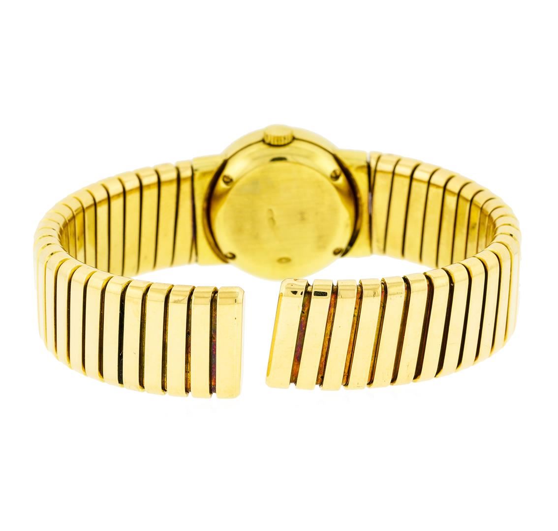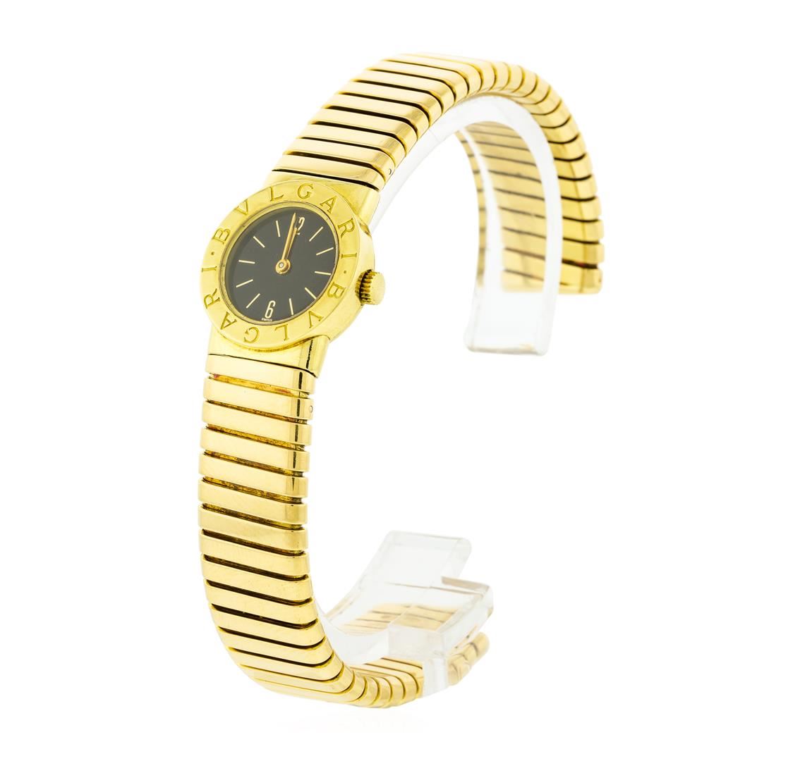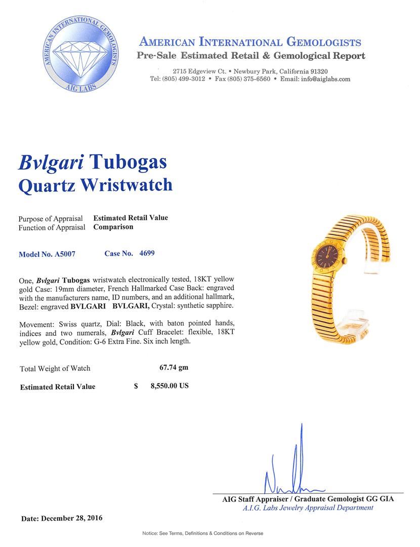 One, Bvlgari Tubogas wristwatch electronically tested, 18KT yellow gold Case: 19mm diameter, French Hallmarked Case Back: engraved with the manufacturers name, ID numbers, and an additional hallmark, Bezel: engraved BVLGARI BVLGARI, Crystal: synthetic sapphire. Movement: Swiss quartz, Dial: Black, with baton pointed hands, indices and two numerals, Bvlgari Cuff Bracelet: flexible, 18KT yellow gold, Condition: G-6 Extra Fine. Six inch length. Total Weight of Watch 67.74gm. AIG Appraised at $8,550.00.