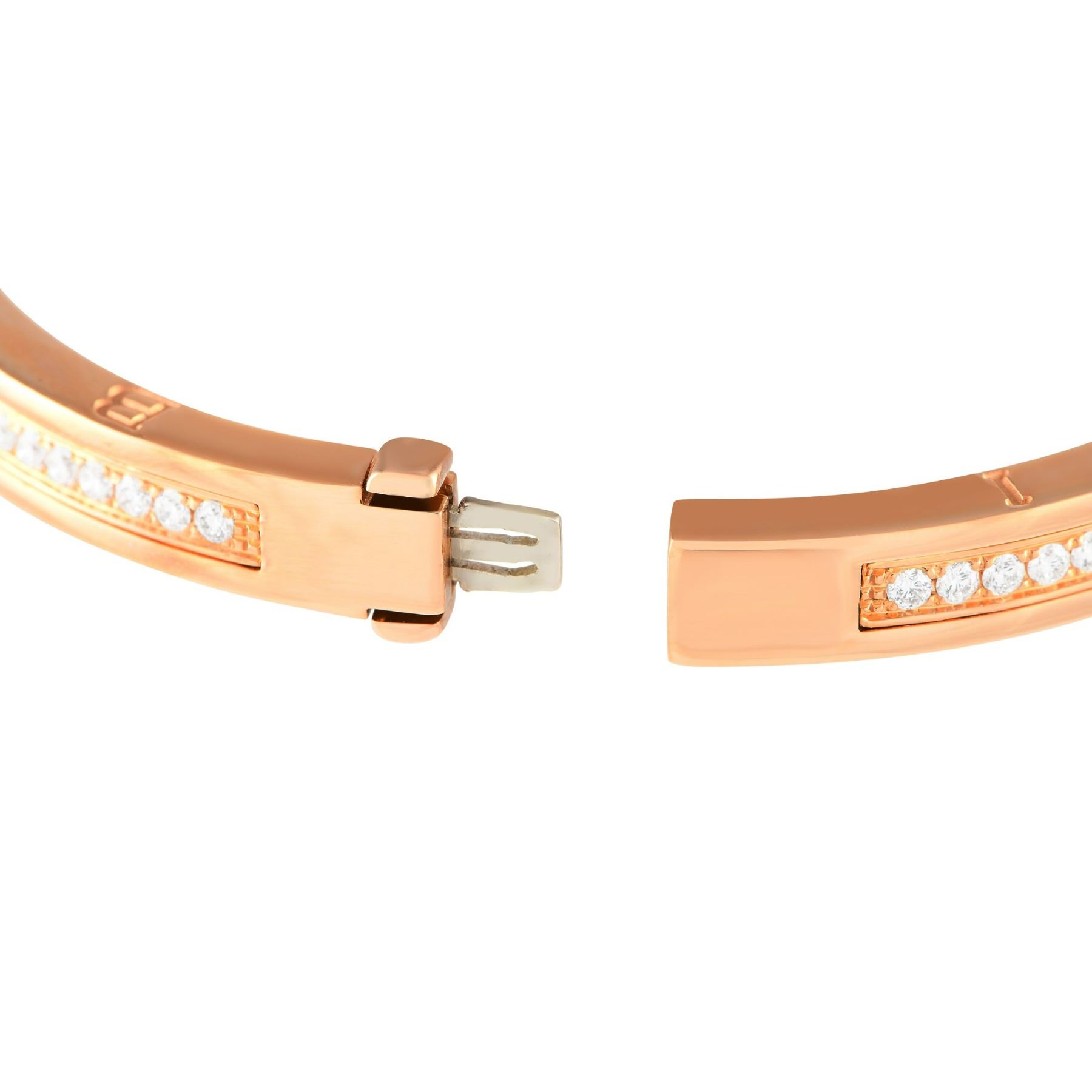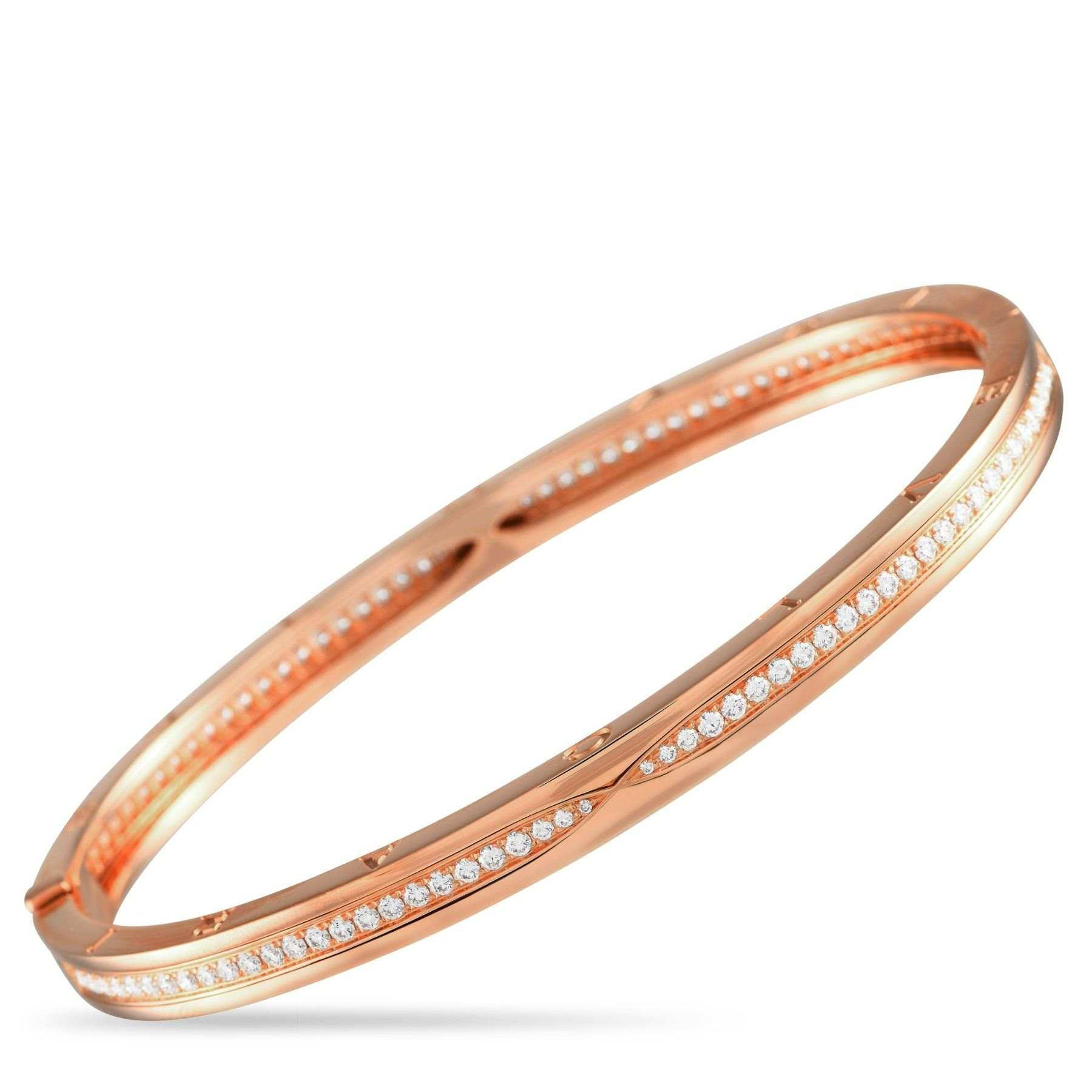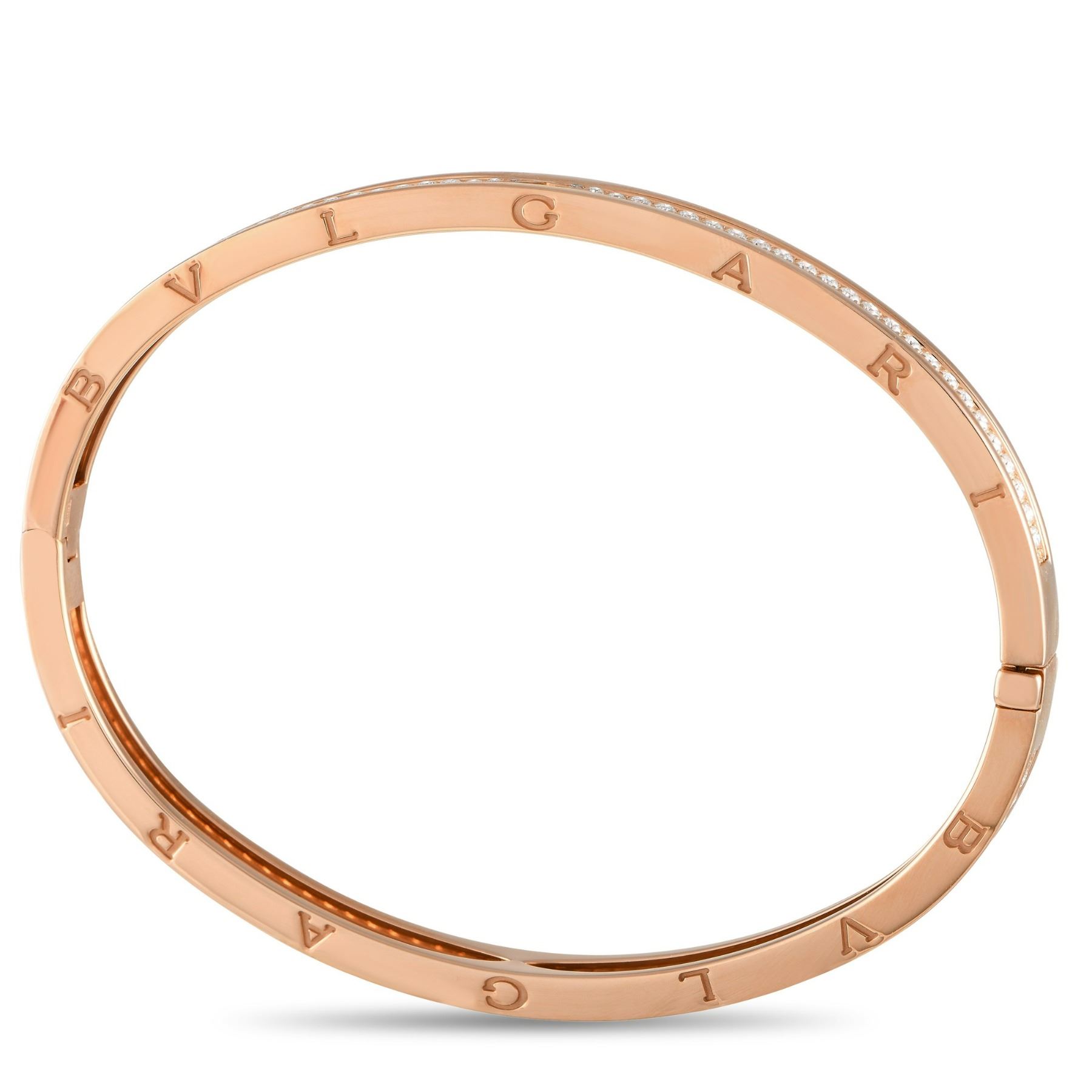 This impeccably crafted Bvlgari B.Zero bangle bracelet is a timeless piece that will never go out of style. The sleek, understated 18K Rose Gold setting comes to life thanks to a series of sparkling Diamonds totaling 1.41 carats and the luxury brands signature engraved on each end. This size Large bracelet measures 8.6 long.This jewelry piece is offered in estate condition and includes a gift box.