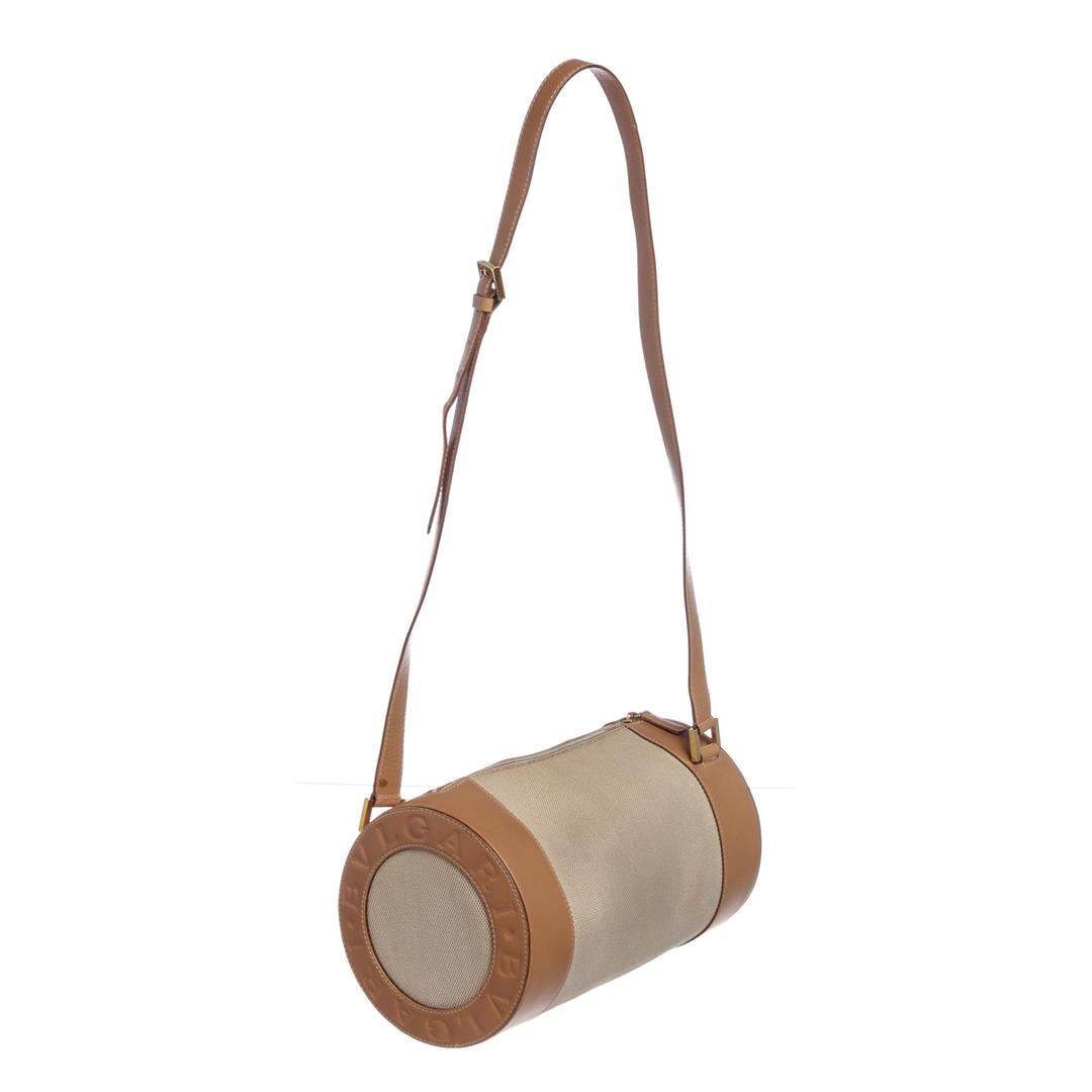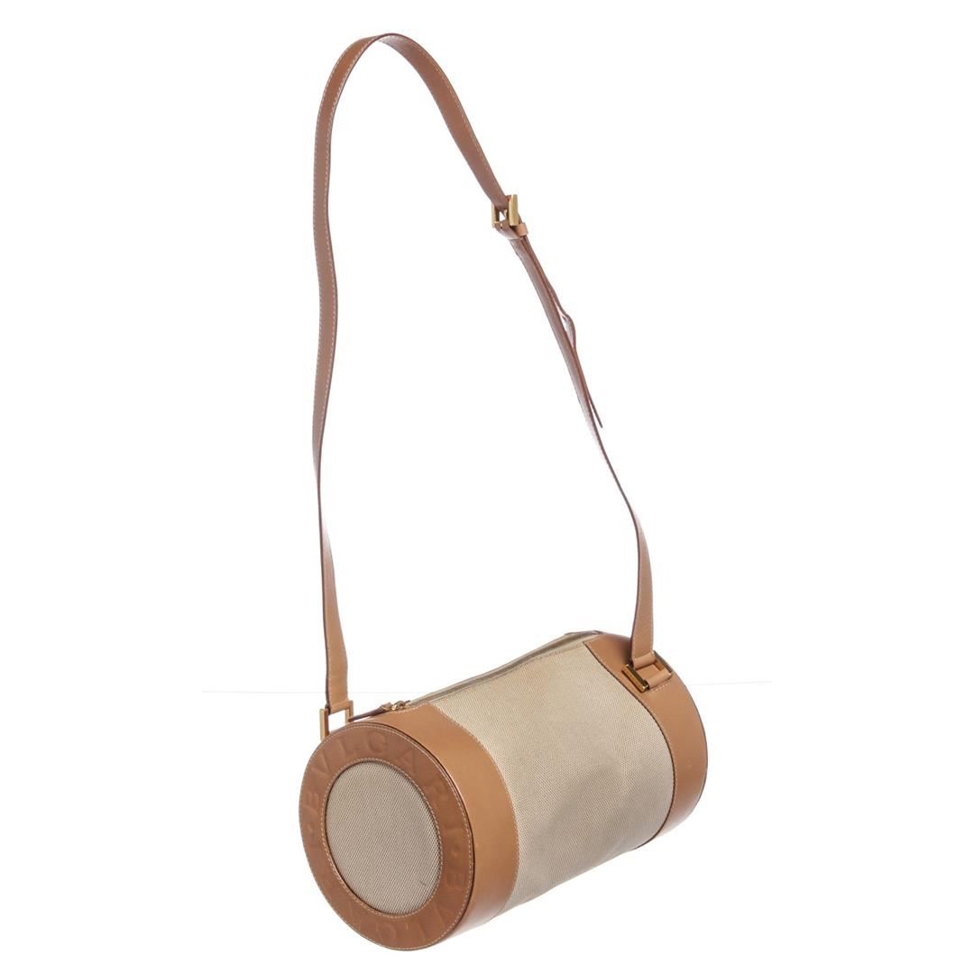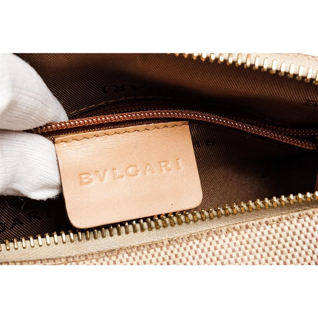 Beige brown Bvlgari canvas leather BZero shoulder bag with gold-tone hardware, brown fabric logo lining, one zipper pocket at interior wall and a adjustable leather shoulder strap. Overall zipper top closure. Dimensions = 10"x6"x6" Strap Drop:18"/25.40cmx15.24cmx15.24cm Strap Drop:47cm. Item is pre-owned.