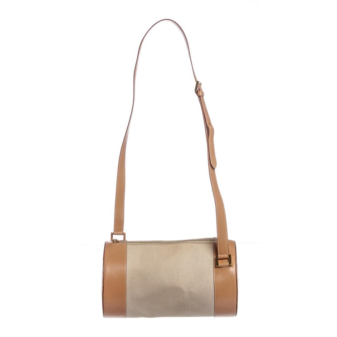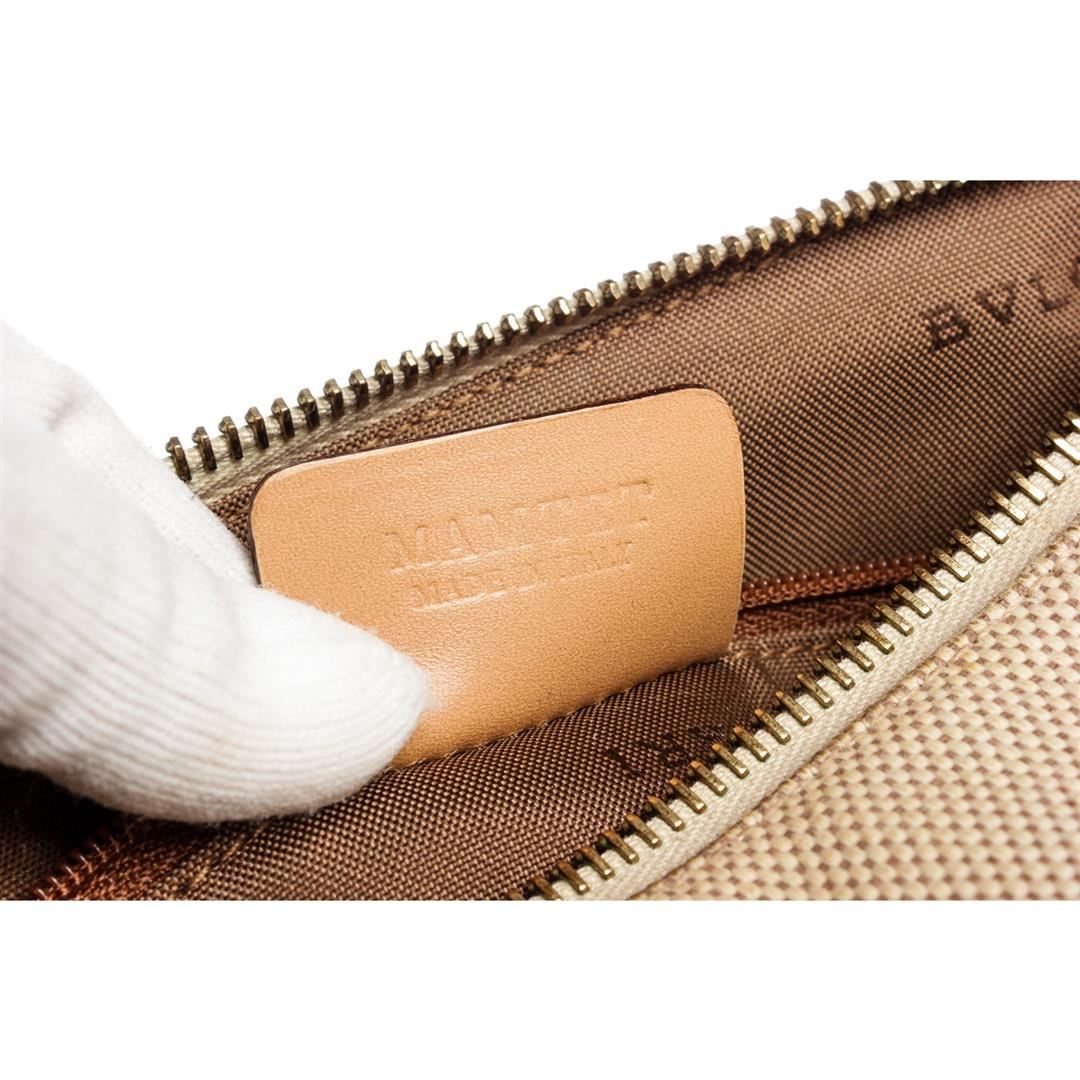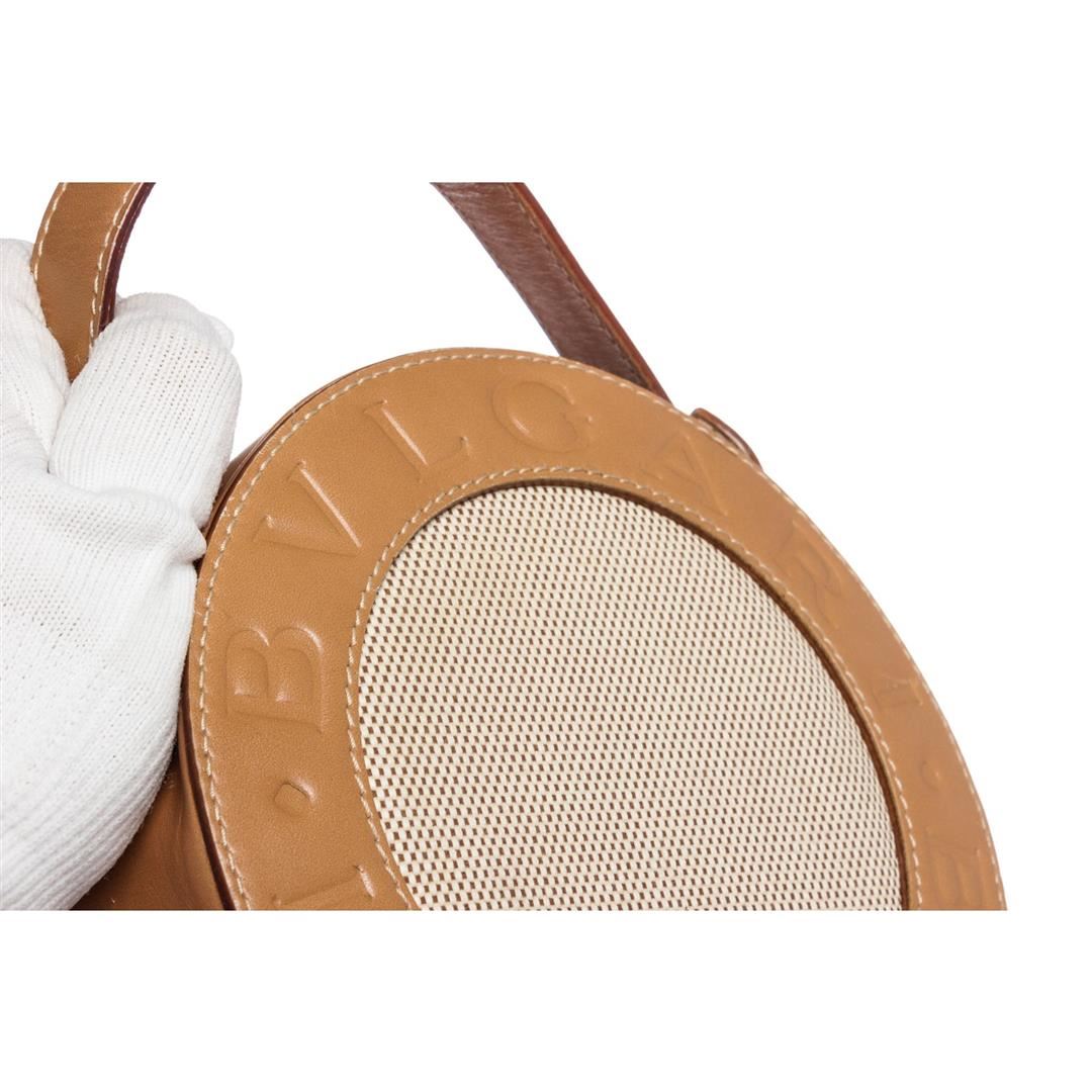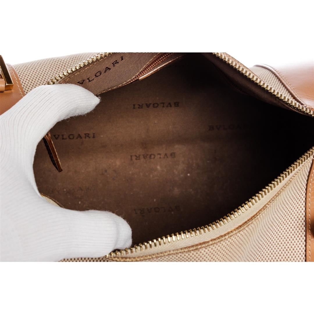 Beige brown Bvlgari canvas leather BZero shoulder bag with gold-tone hardware, brown fabric logo lining, one zipper pocket at interior wall and a adjustable leather shoulder strap. Overall zipper top closure. Dimensions = 10"x6"x6" Strap Drop:18"/25.40cmx15.24cmx15.24cm Strap Drop:47cm. Item is pre-owned.