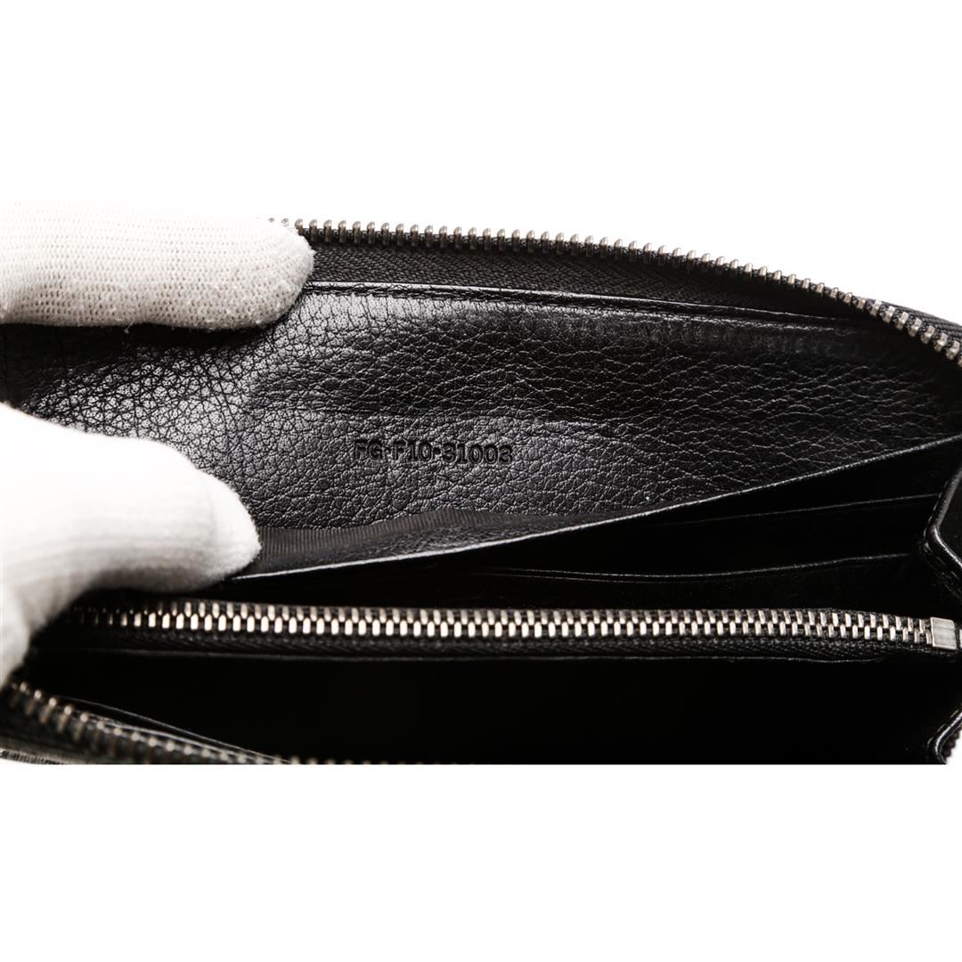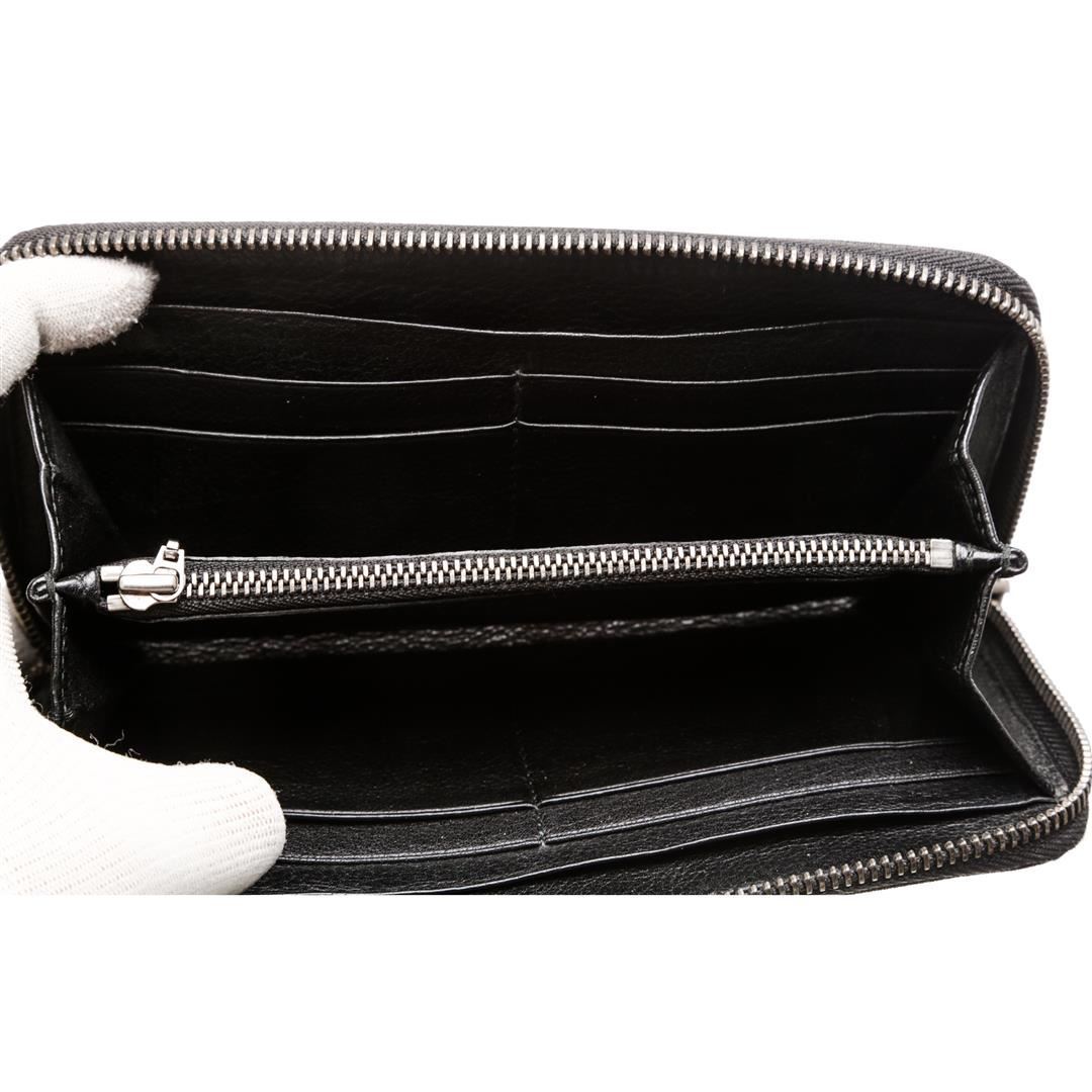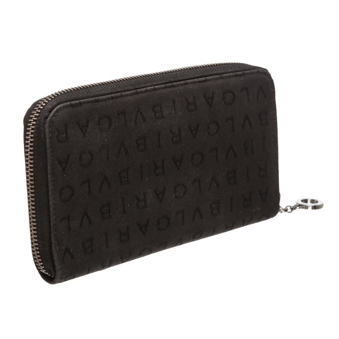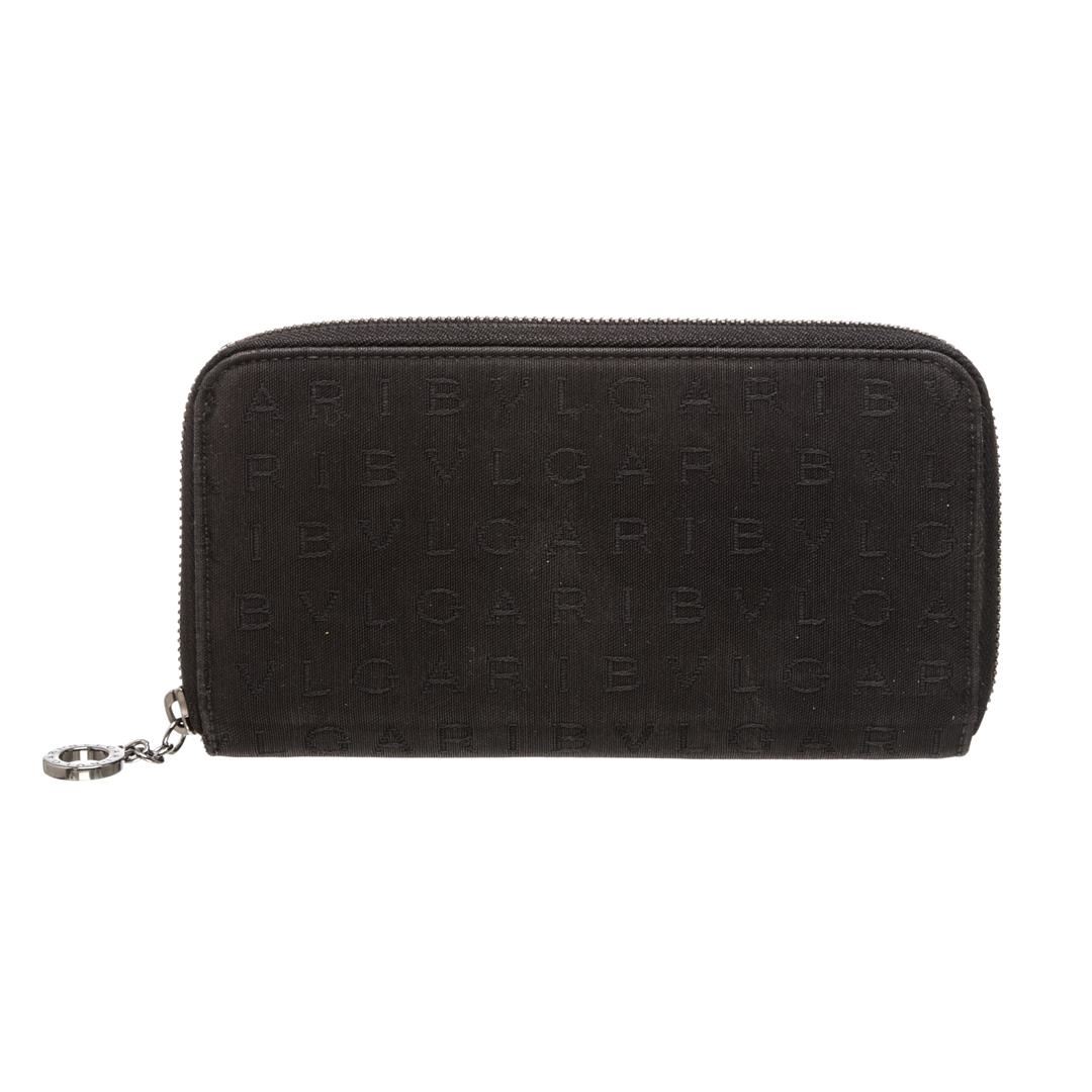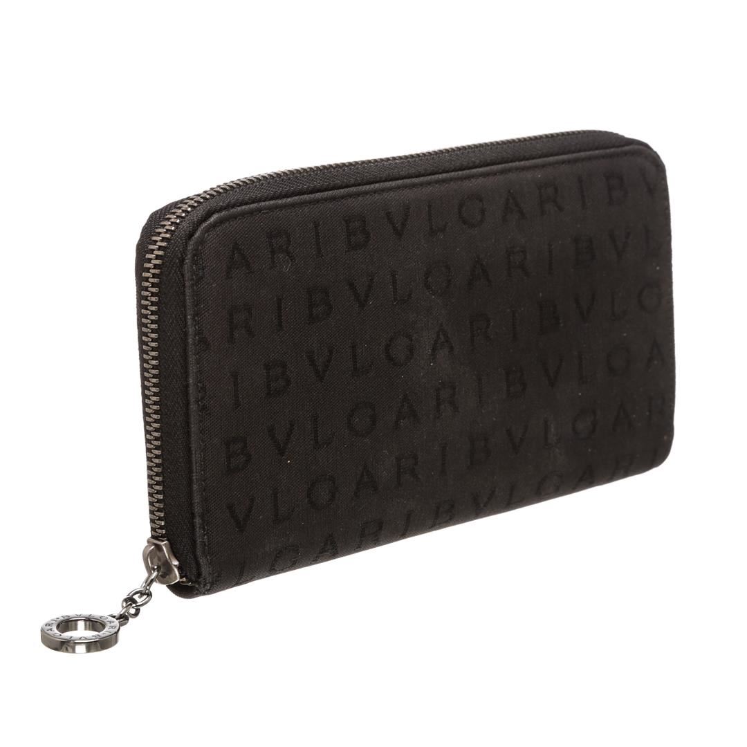 Black fabric leather Bvlgari logo zipper wallet with silver-tone hardware, black leather lining, eight credit card slots, two open pockets, one zipper pocket, two side slip pockets and overall zipper closure.