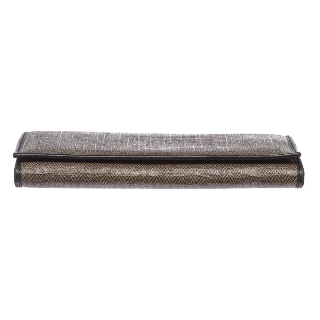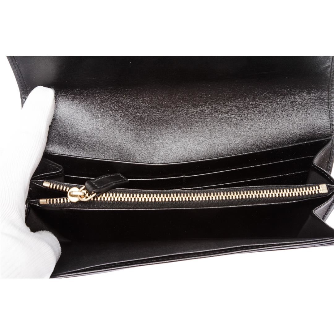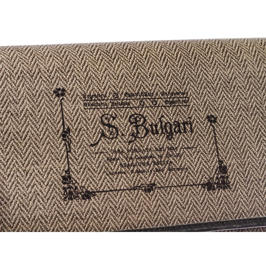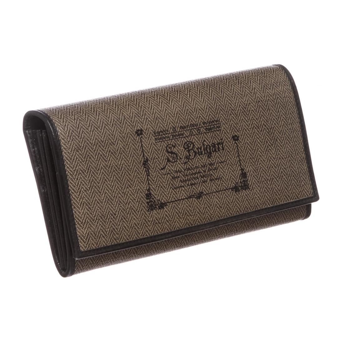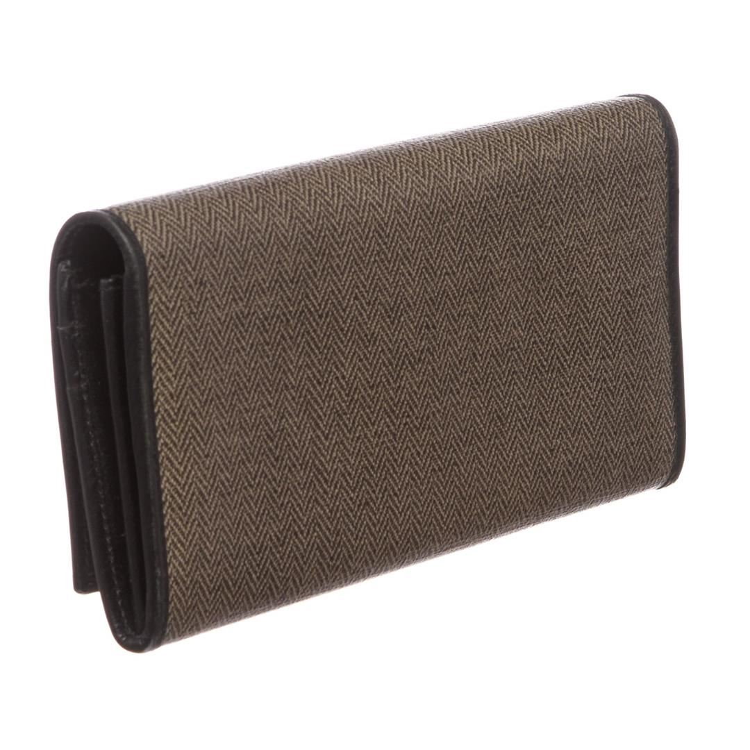 Overall flap snap closure. Interior is leather lined with ten credit card slip pockets, two compartments with zipper pocket partition and one billfold slip pocket.