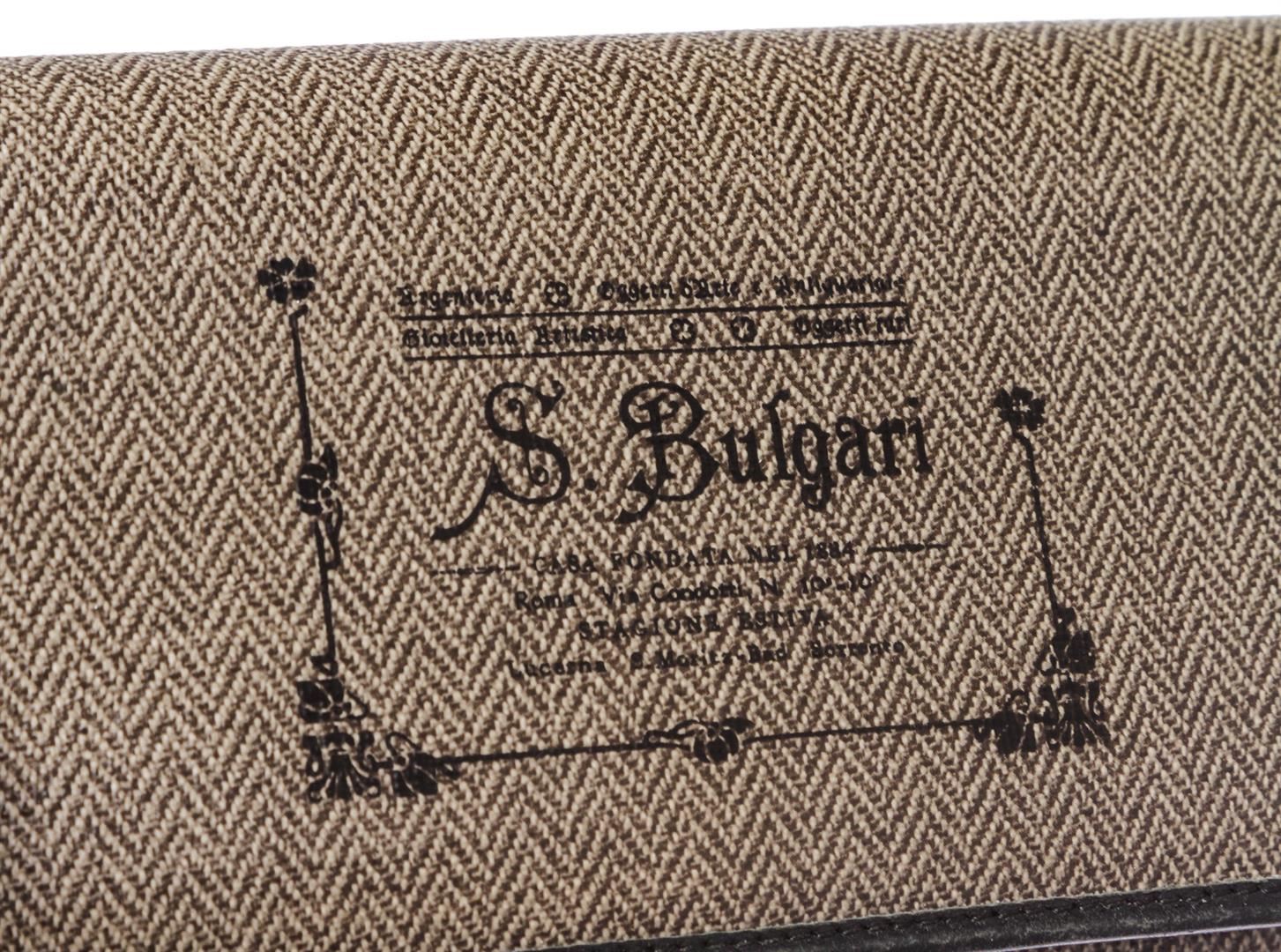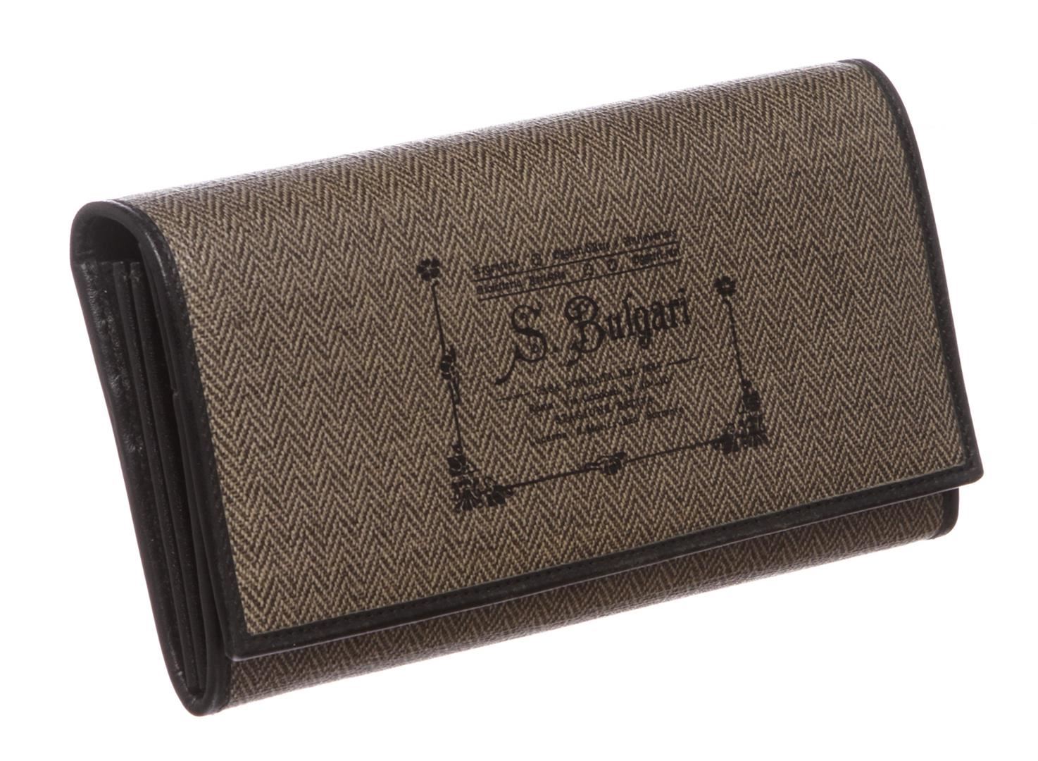 Overall flap snap closure. Interior is leather lined with ten credit card slip pockets, two compartments with zipper pocket partition and one billfold slip pocket.